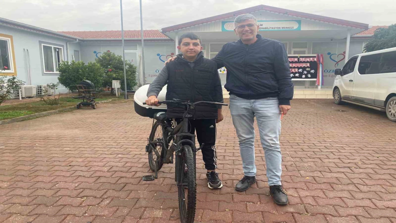 KENDİ BAŞINA BİSİKLETİNE BAĞLADIĞI MÜZİK SİSTEMİNİ AÇARAK HER GÜN OKULA GELEN ÖZEL REHABİLİTASYON ÖĞRENCİSİ BAYRAM EFE, " MÜZİK DİNLEMEYİ ÇOK SEVİYORUM. BİSİKLETİMİ GÖRENLER VİDEO ÇEKİYOR. 'SEN Mİ YAPTIN ?' DİYE SORUYORLAR. BEN YAPTIM DEYİNCE İNANMIYORLAR" DEDİ.