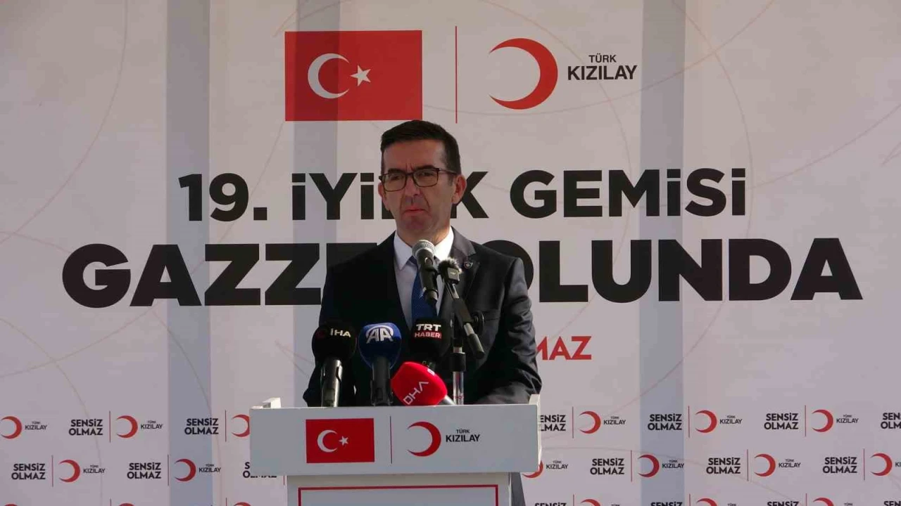 Törende konuşan Türk Kızılay Yönetim Kurulu Üyesi Kamil Karadeniz, Gazze’de yaşanan insani dramın tüm insanlığın vicdanında derin izler bıraktığını belirterek, "Türk Kızılay olarak, ülkemizin 19’uncu Gazze İyilik Gemisini, gönüllerde kandil yakma muradıyla, umutla, dua ile ve dayanışmayla yolcu ediyoruz. Gazze’de iki yılı aşkın süredir devam eden insani dram, yalnızca bir coğrafyanın değil, tüm insanlığın vicdanında derin izler bırakan ağır bir imtihandır. On binlerce çocuk ve kadın hayatını kaybetti. Yüz binlerce insan yaralandı. Evlerini, sevdiklerini, uzuvlarını kaybeden masumlar; bir lokma ekmeğe, bir yudum suya muhtaç bırakıldı" diye konuştu.