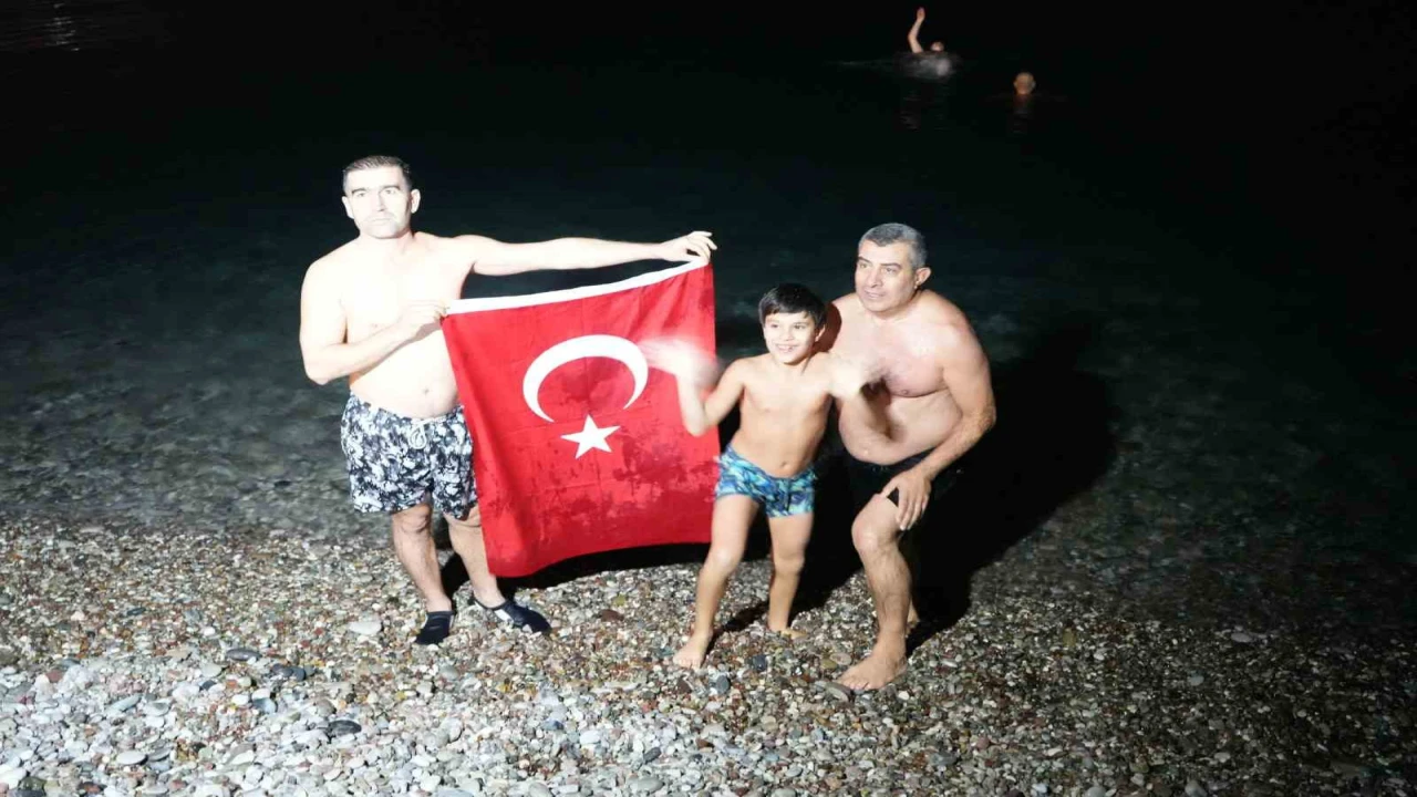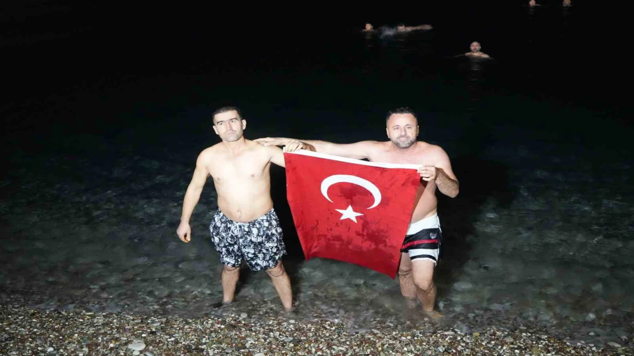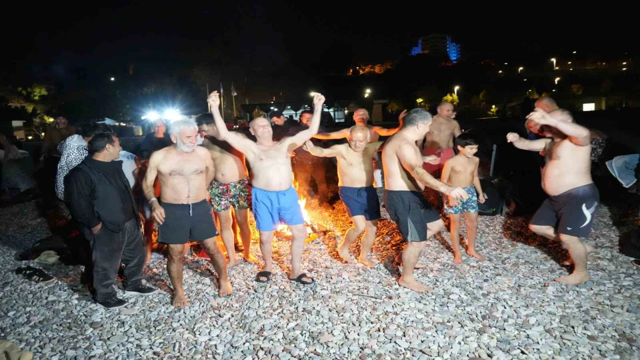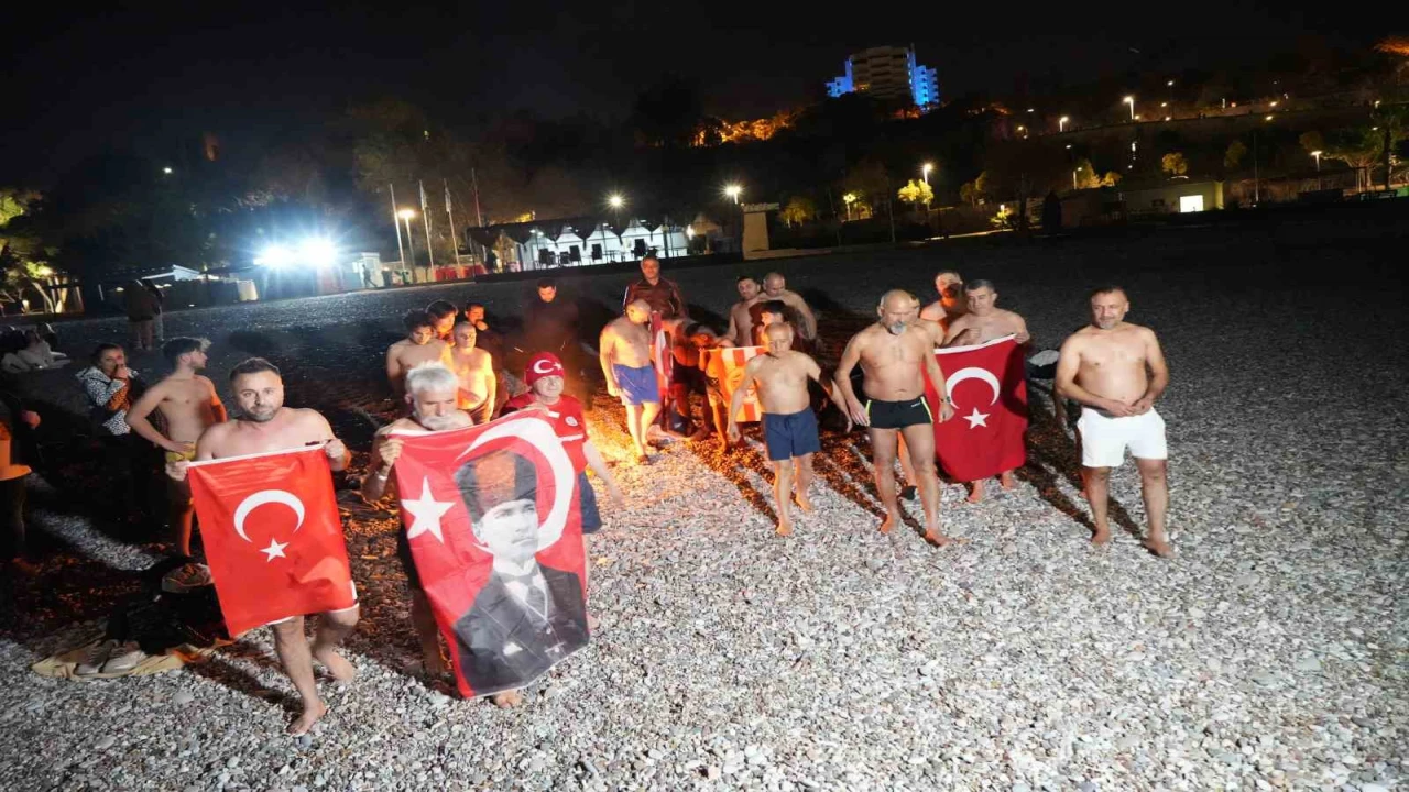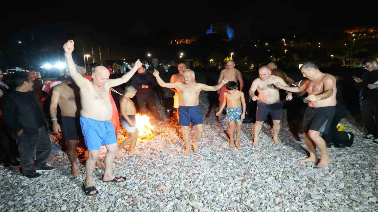 Gece saatlerinde Konyaaltı Sahili’nde bir araya gelen yaklaşık 30 kişilik grup, ellerinde Türk bayrakları ve Mustafa Kemal Atatürk’ün posteriyle 10’dan geriye sayarak yeni yılı karşıladı. Saatler gece yarısını gösterdiğinde ise hep birlikte denize girerek 2025’in ilk dakikalarını denizde geçirdi.