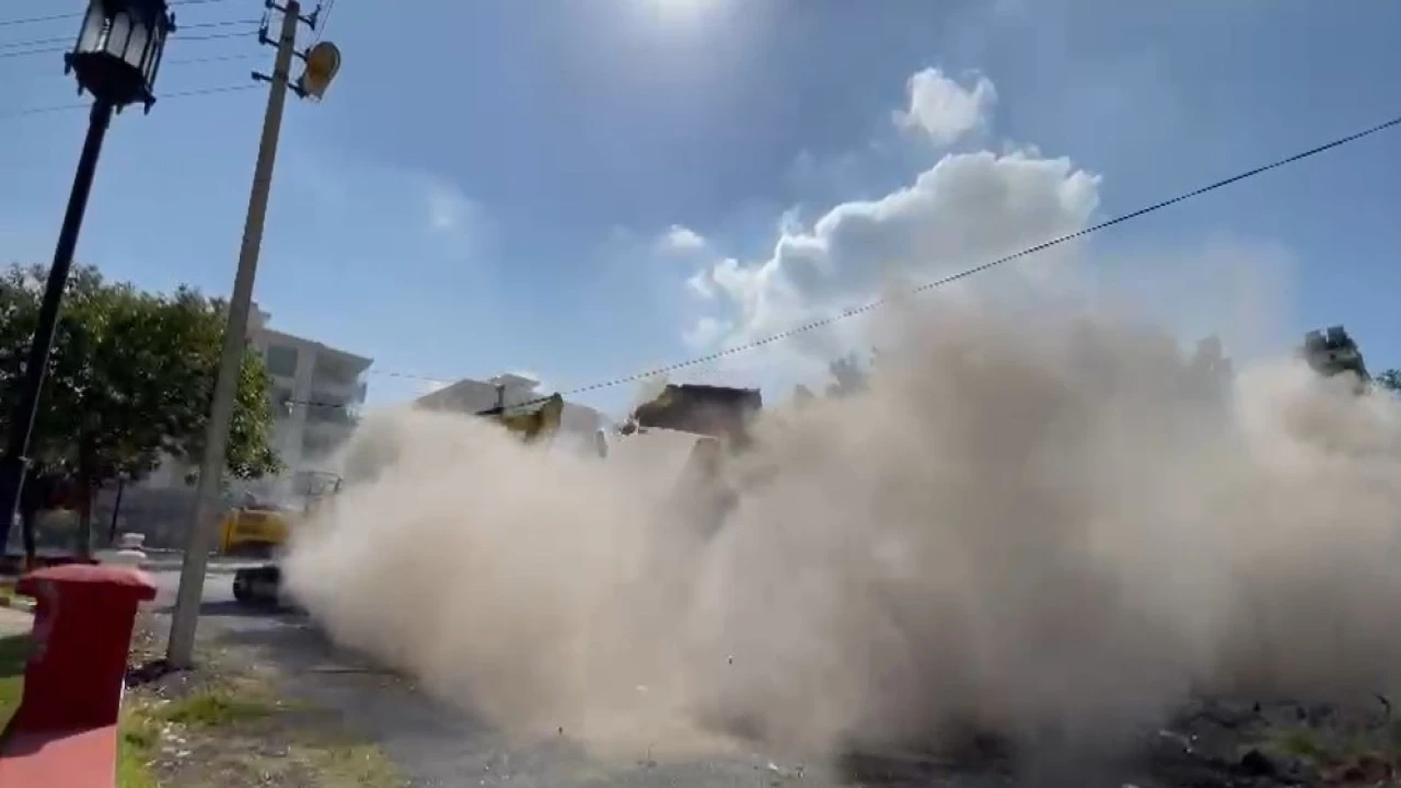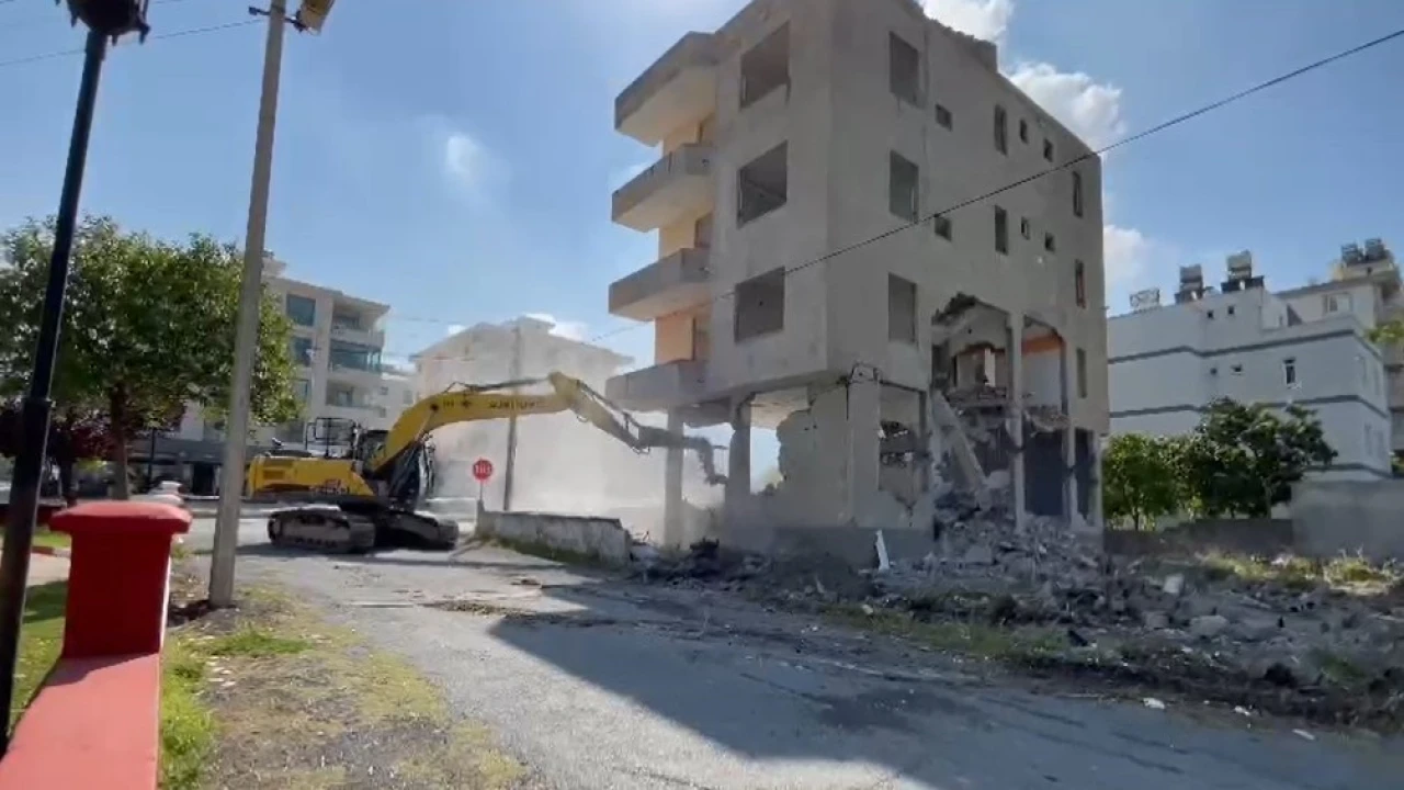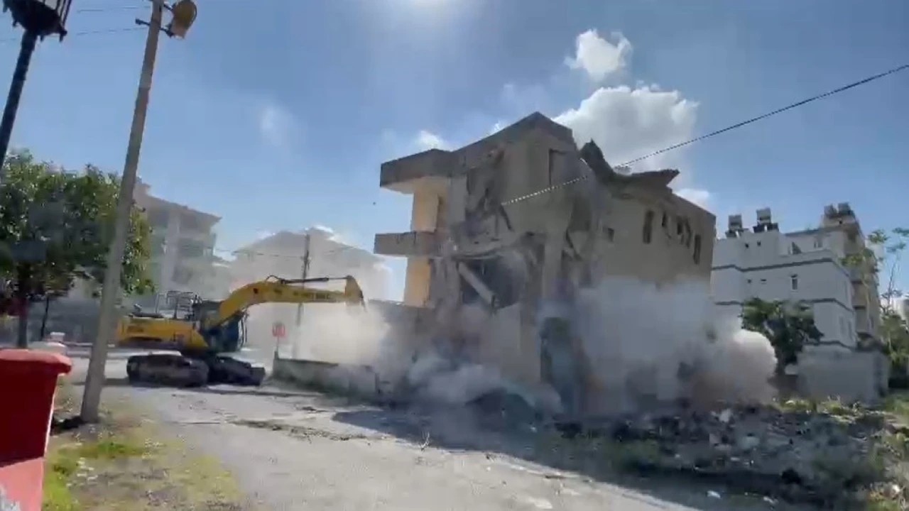 HATAY’IN DÖRTYOL İLÇESİNDE 4 KATLI BİNANIN İŞ MAKİNESİNİN DARBESİYLE YERLE BİR OLDUĞU ANLAR KAMERAYA YANSIDI.