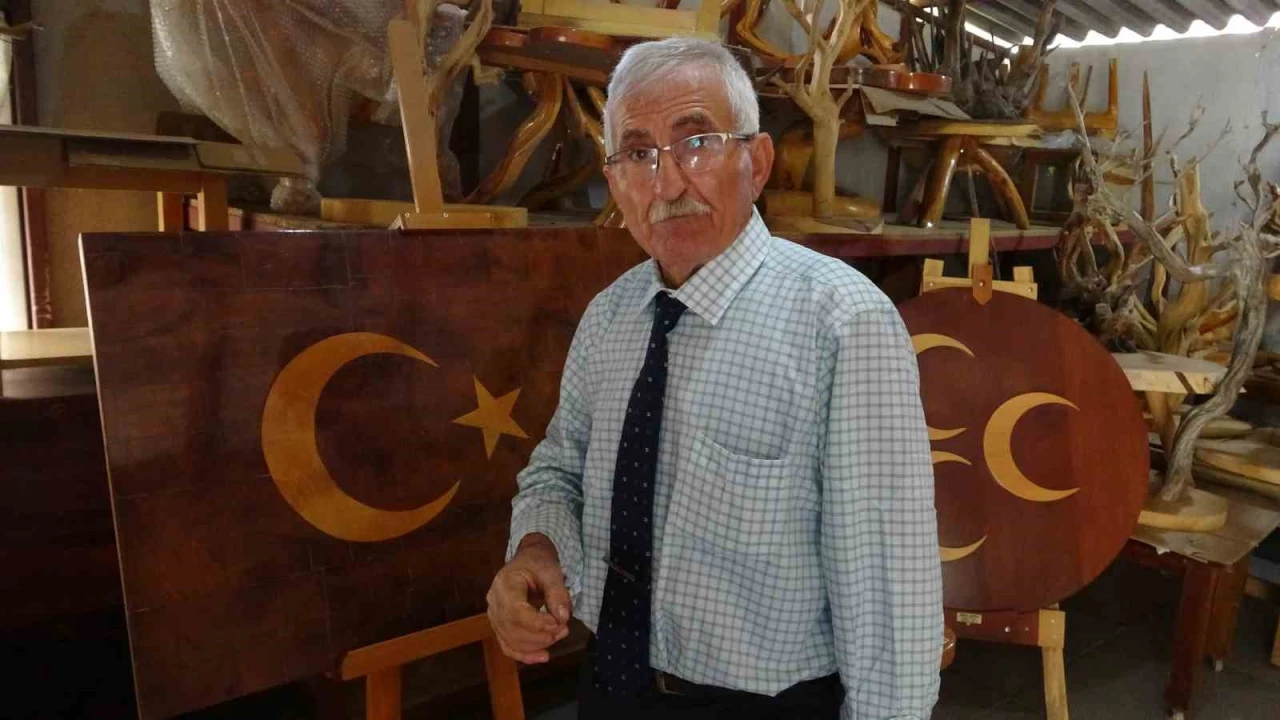 Isparta’nın Sütçüler ilçesi Çandır Köyü’nde yaşayan emekli ahşap ustası Mustafa Şahinkaya, doğadan topladığı ağaç figürlerini işleyerek sanata dönüştürüyor. 15 Temmuz şehitleri anısına yaptığı 246 parçalık Türk bayrağı eseri ise sergilerde büyük beğeni topluyor.
