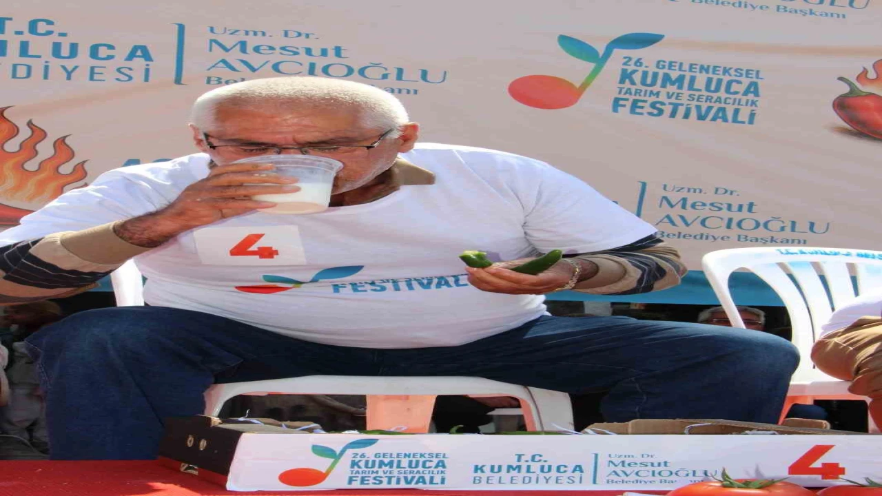 Kumluca ilçesinde bu yıl 27’ncisi düzenlenen Tarım ve Seracılık Festivali kapsamında gerçekleştirilen acı biber yeme yarışması büyük ilgi gördü. Kumluca Cumhuriyet Meydanı’nda düzenlenen yarışmada, 3 dakikada 398 gram acı biber yiyen Celal Derin birinci oldu. Geçtiğimiz yıl ikinci olan Derin, bu yıl şampiyonluk hedefiyle katıldığını söyledi.