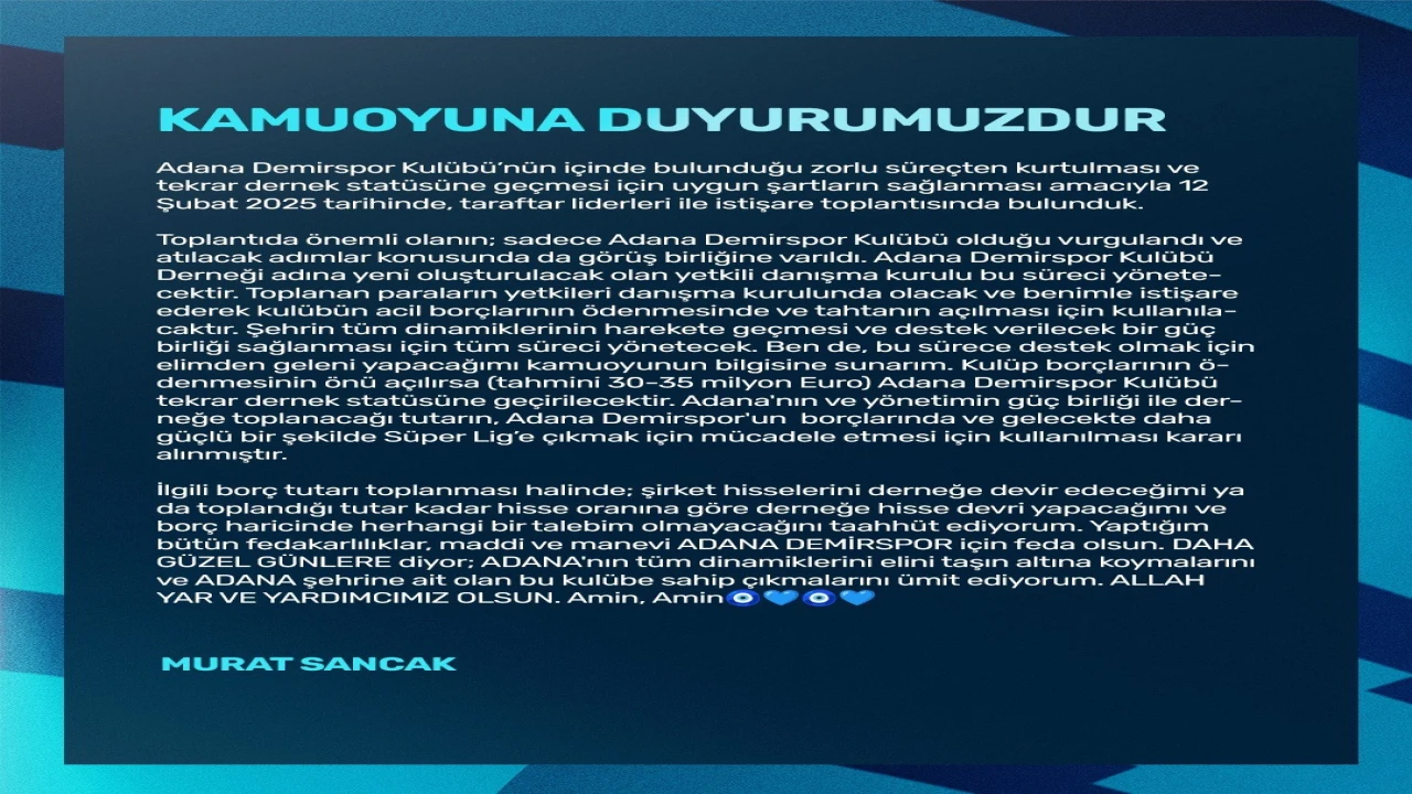 Adana Demirspor Kulübü Başkanı Murat Sancak, kulübün sosyal medya hesabından yaptığı açıklamada, 12 Şubat’ta taraftar liderleriyle istişare toplantısı düzenlediklerini belirterek, "Toplantıda önemli olanın sadece Adana Demirspor olduğu vurgulandı ve atılacak adımlar konusunda görüş birliğine varıldı. Adana Demirspor Kulübü Derneği adına yeni oluşturulacak yetkili danışma kurulu, bu süreci yönetecektir. Toplanan paraların yetkileri danışma kurulunda olacak ve benimle istişare ederek kulübün acil borçlarının ödenmesinde ve tahtanın açılması için kullanılacaktır" ifadelerini kullandı.