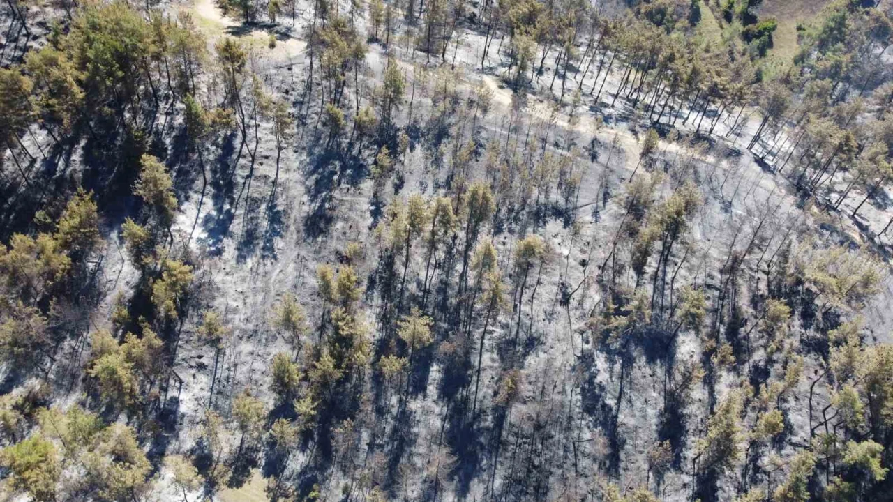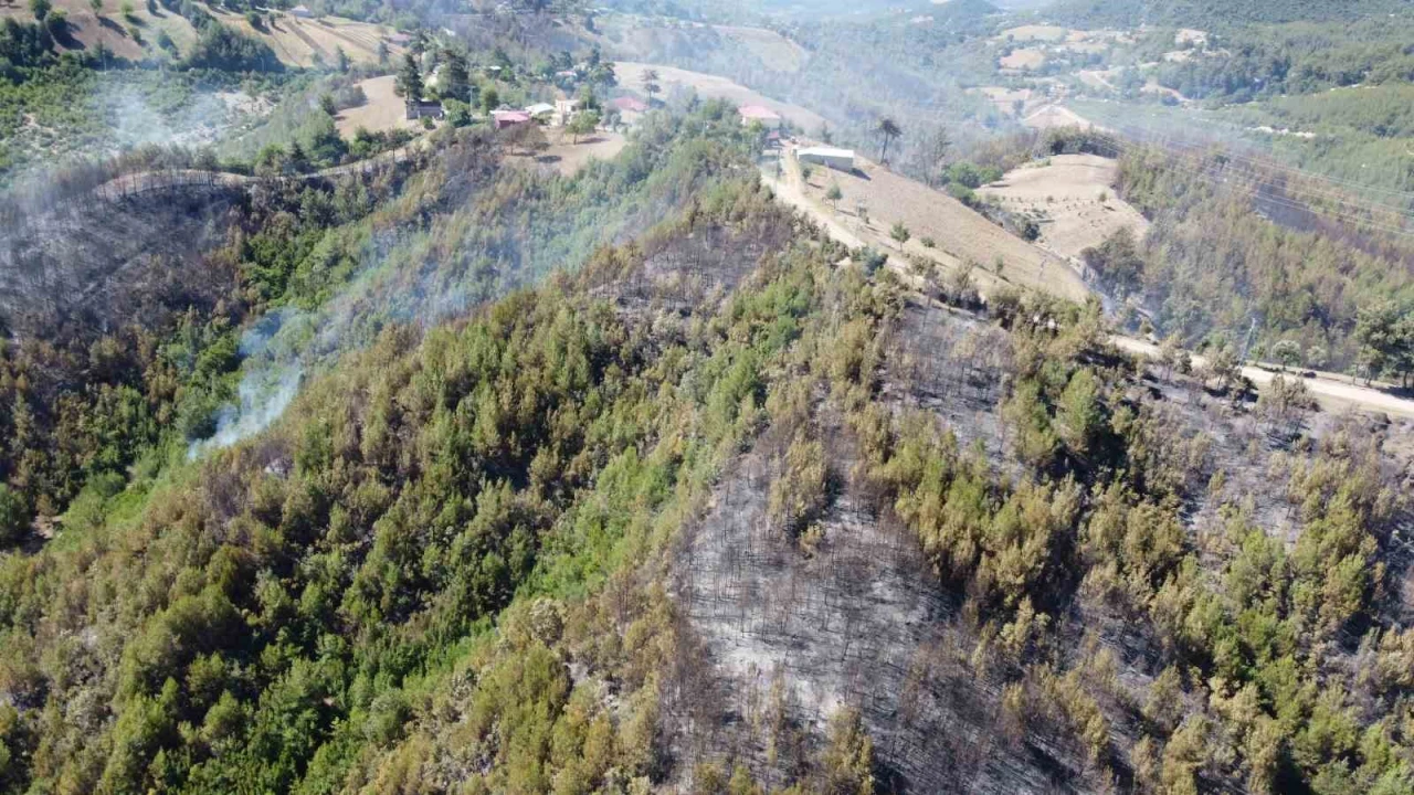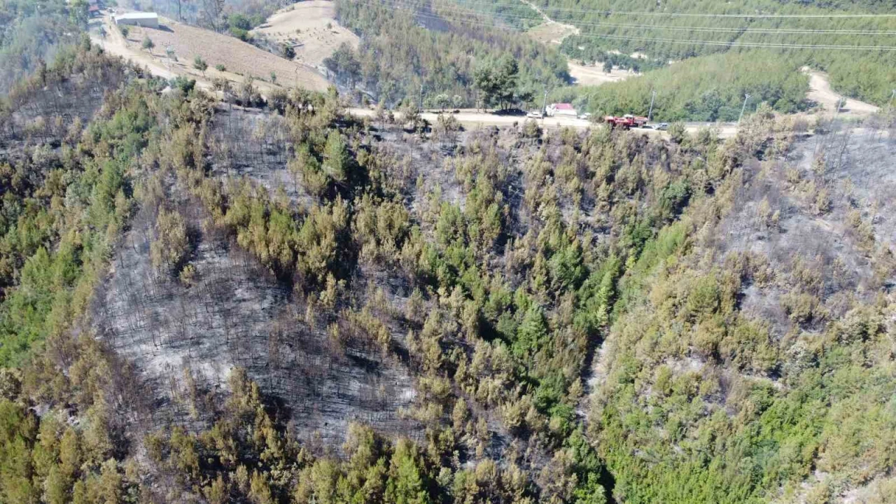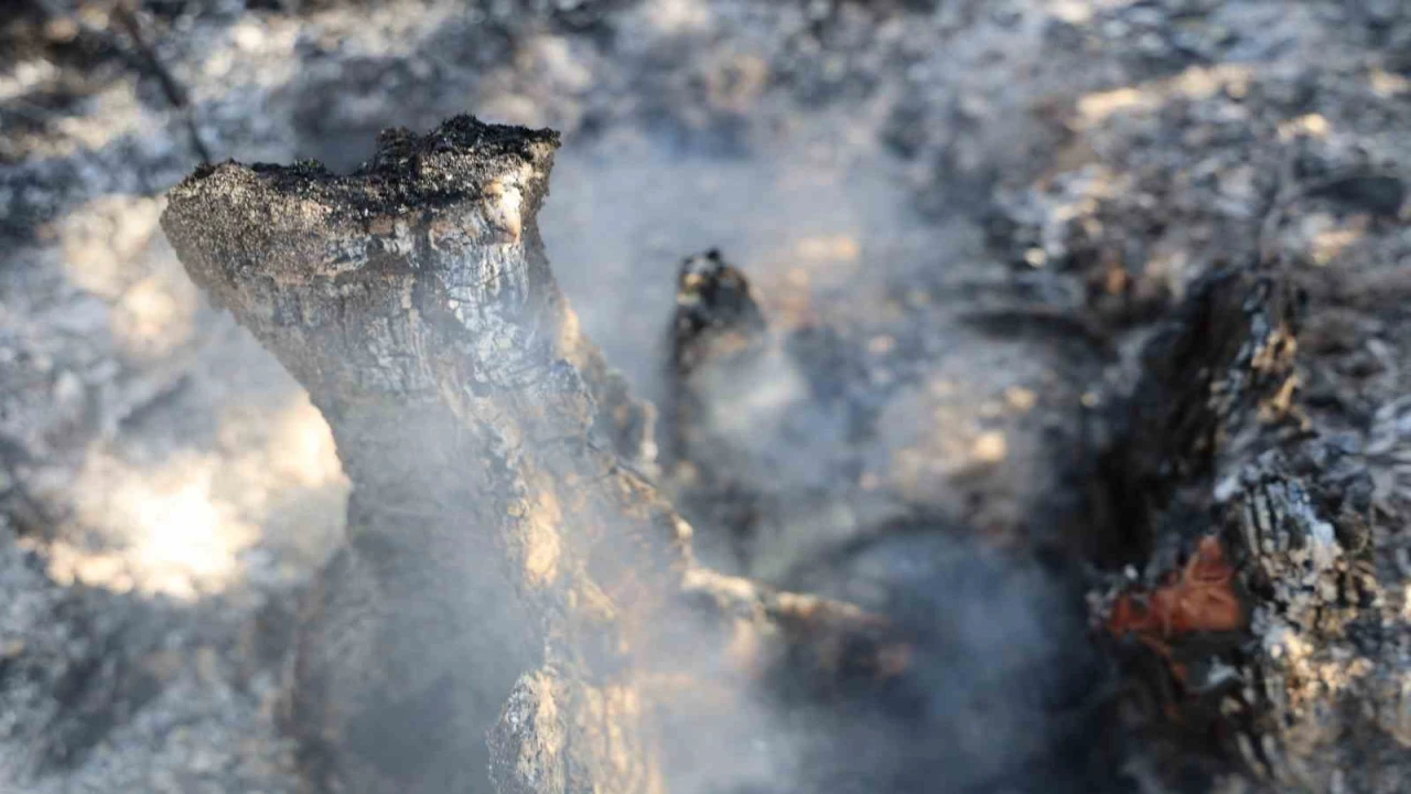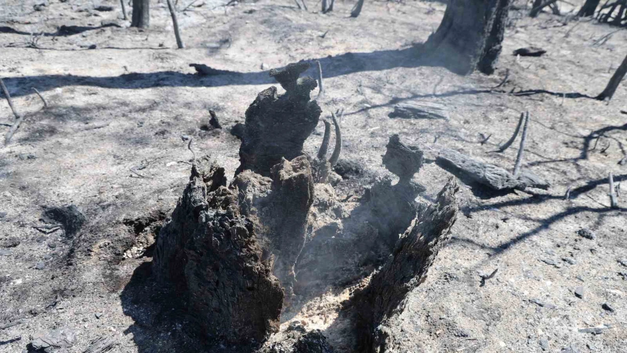 Orman yangın söndürme ekipleri, bölgede soğutma çalışmalarını sürdürürken, yangının geride bıraktığı kara örtü ve yanan ağaçlar acı tabloyu gözler önüne serdi.