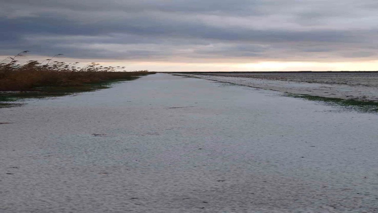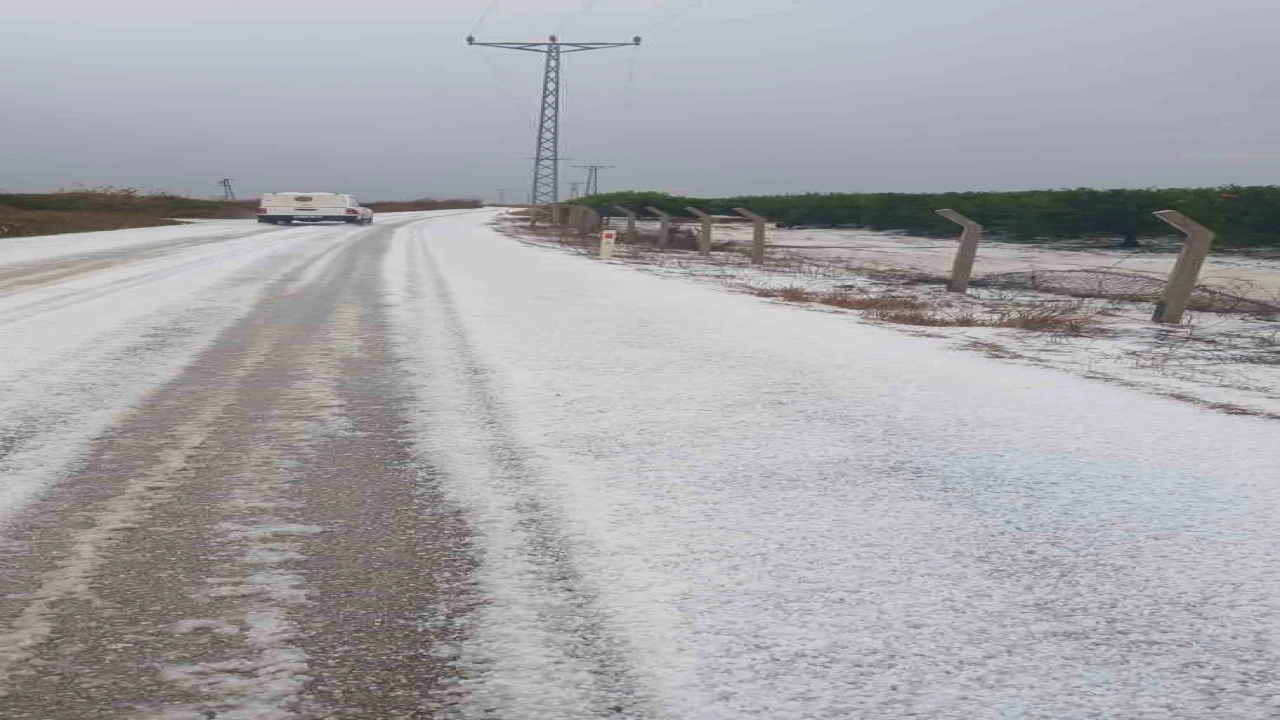 Adana’nın Karataş ilçesinde yağan dolu, yolları ve tarlaları beyaza bürüdü.