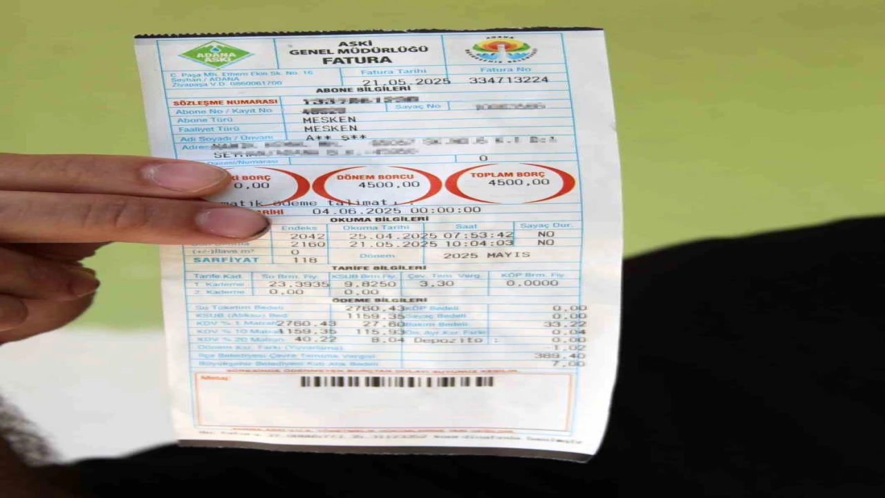 ADANA'DA MÜSTAKİL BİR EVDE YAŞAYAN BİR VATANDAŞ, SU FATURASINI GÖRÜNCE ADETA ŞOK GEÇİRDİ. ÖNCEKİ AYLARDA 3 AYLIK KULLANIM İÇİN 1084 TL ÖDEYEN ADAM, BU KEZ TEK BİR AY İÇİN GELEN 4 BİN 500 LİRALIK FATURAYLA NEYE UĞRADIĞINI ŞAŞIRDI. "HAVUZUM OLSA BÖYLE BİR FATURA GELMEZDİ" DİYEREK DURUMA TEPKİ GÖSTERDİ.