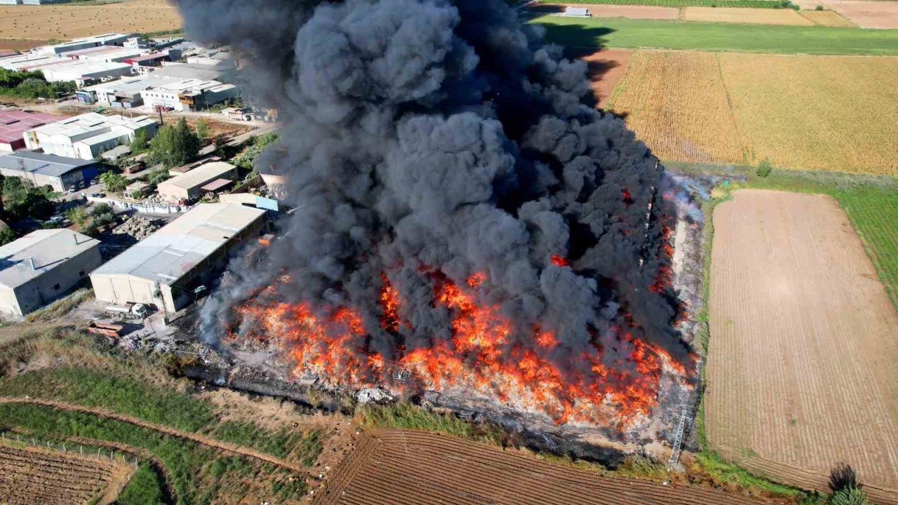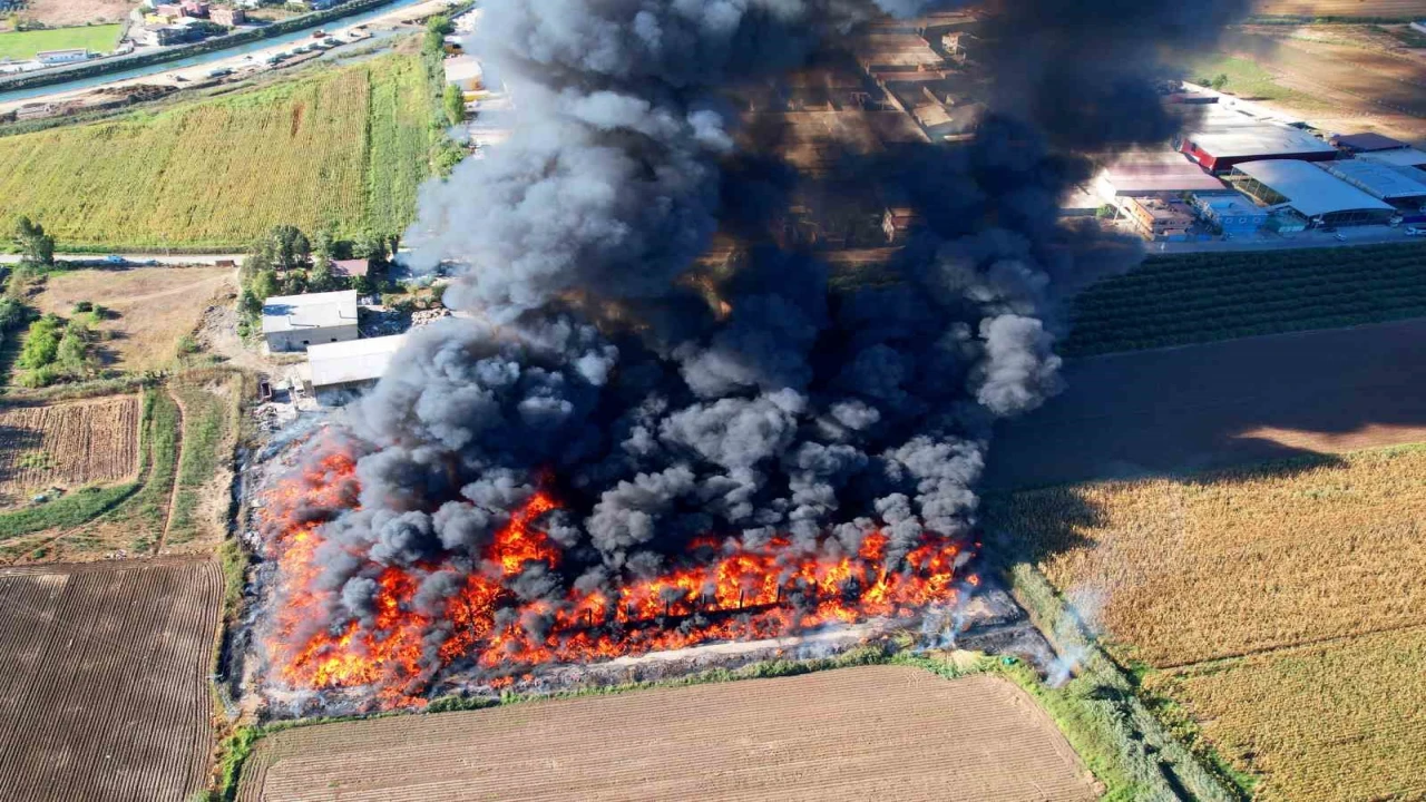 ADANA'DA GERİ DÖNÜŞÜM FABRİKASININ BAHÇESİNDEKİ YANGIN HAVADAN GÖRÜNTÜLENDİ