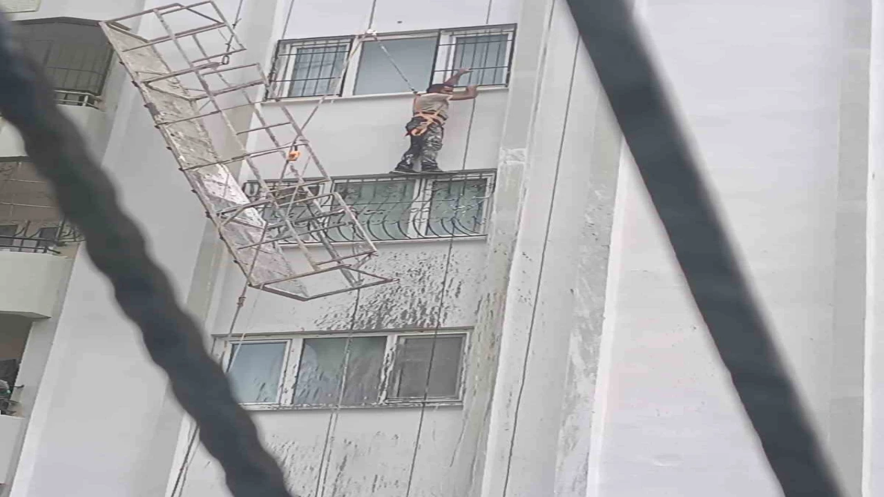 Olay, Yüreğir ilçesine bağlı Kışla Mahallesi’nde meydana geldi. Dış cephe boyası yapan bir işçi, binada kurulu iskelede çalışırken halatın kopmasıyla metrelerce yüksekte asılı kaldı. İşçinin güvenlik kemerinin takılı olması facianın önüne geçti. İşçinin havada asılı kaldığı anlar çevredeki vatandaşlar tarafından cep telefonuyla görüntülendi. Korku dolu dakikaların ardından olay yerine sevk edilen itfaiye ekipleri, başarılı bir operasyonla işçiyi kurtardı.