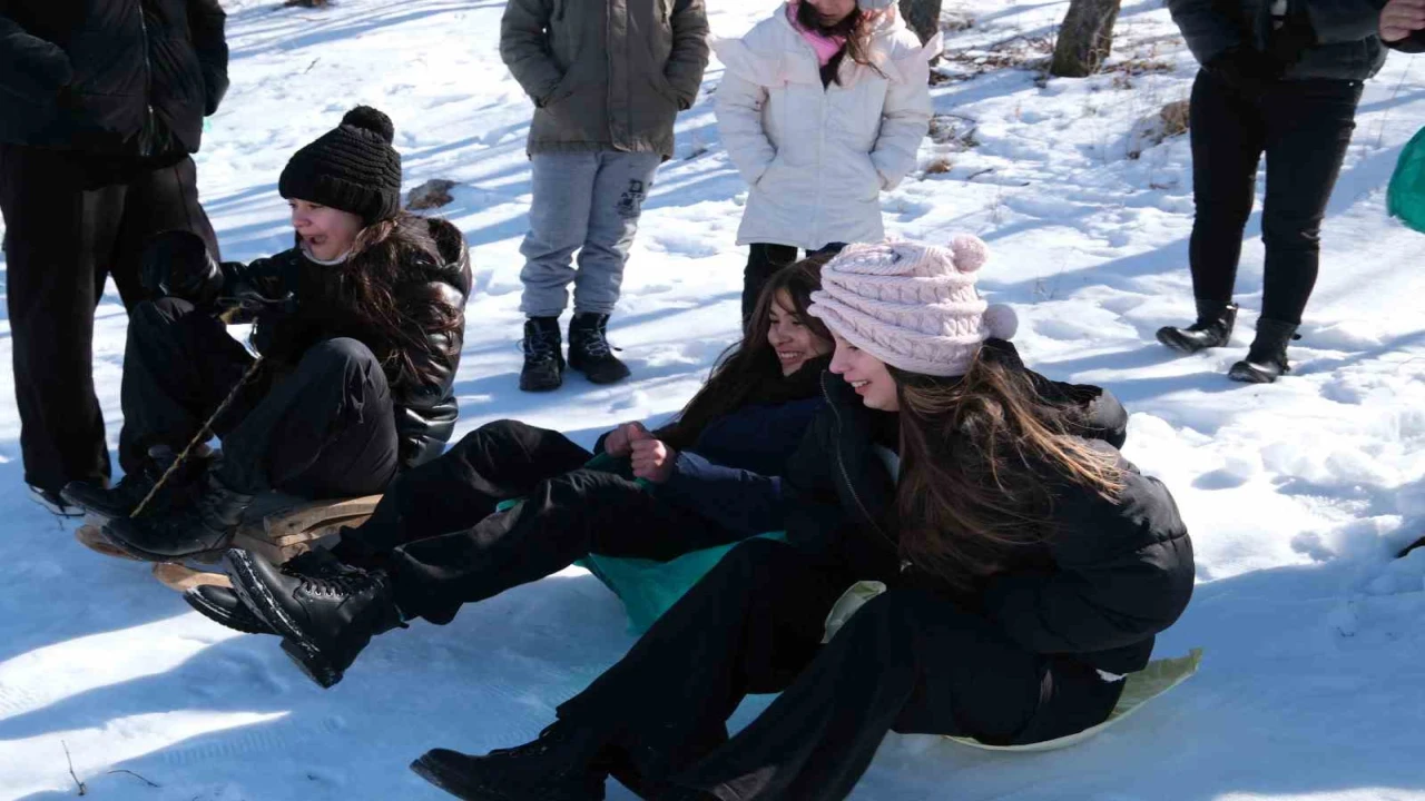 Köy sakinlerinin doyasıya eğlendiği etkinlikte poşet ve kızakla kayan yetişkinler renkli görüntüler oluşturdu.