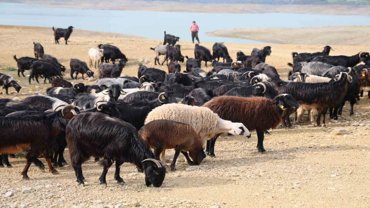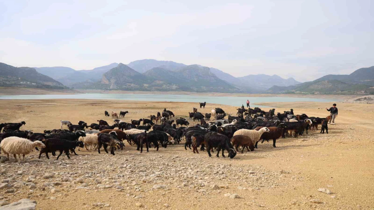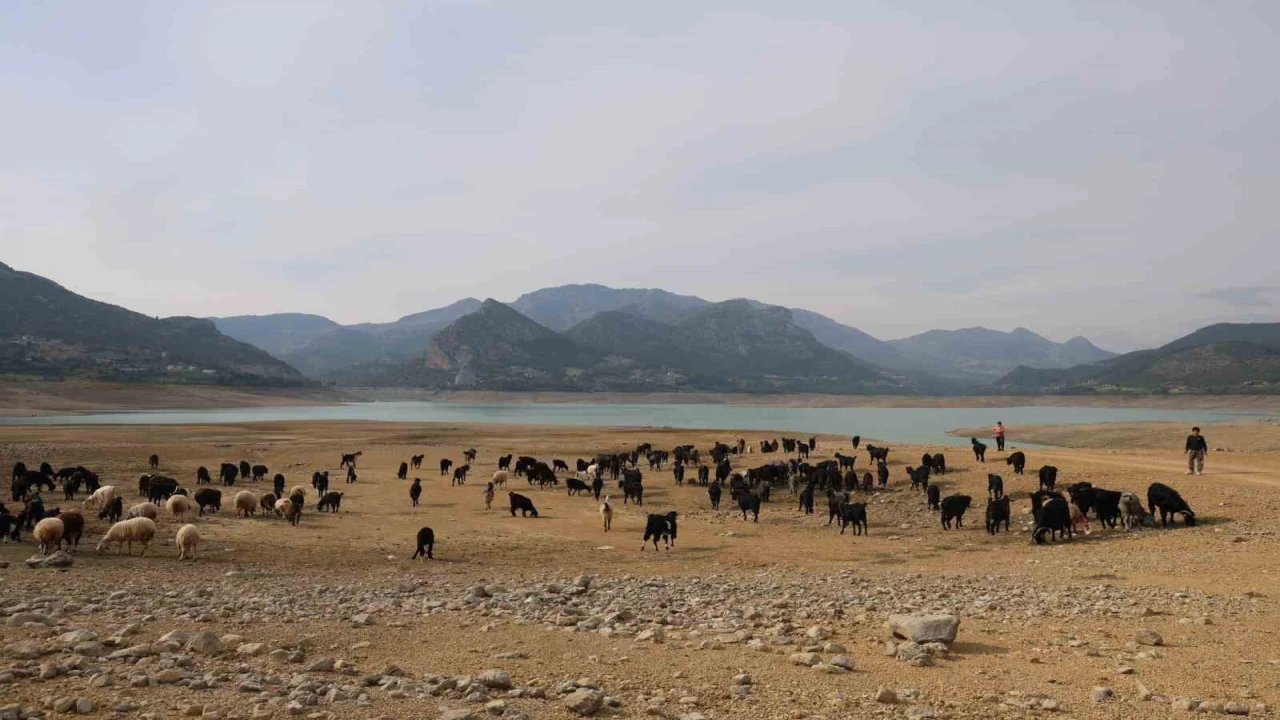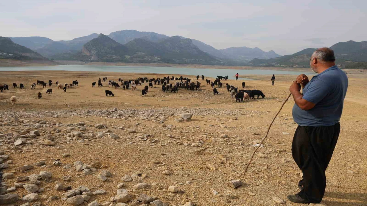 BÜYÜK BÖLÜMÜ KURUYAN BARAJDA ÜRETİCİLER, HAYVANLARINI OTLATMAK İÇİN GETİRSE DE 'KURAKLIKTAN OT BİLE YOK' DİYEREK DURUMU ÖZETLEDİ