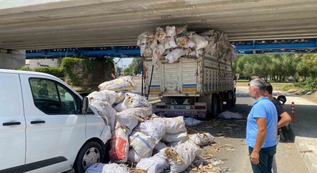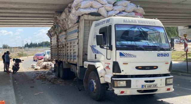Adana’da seyir halindeki kamyon köprü altında sıkıştı. Sıkışan kamyonda yüklü onlarca çuval arkasındaki araca zarar vererek yola saçıldı.