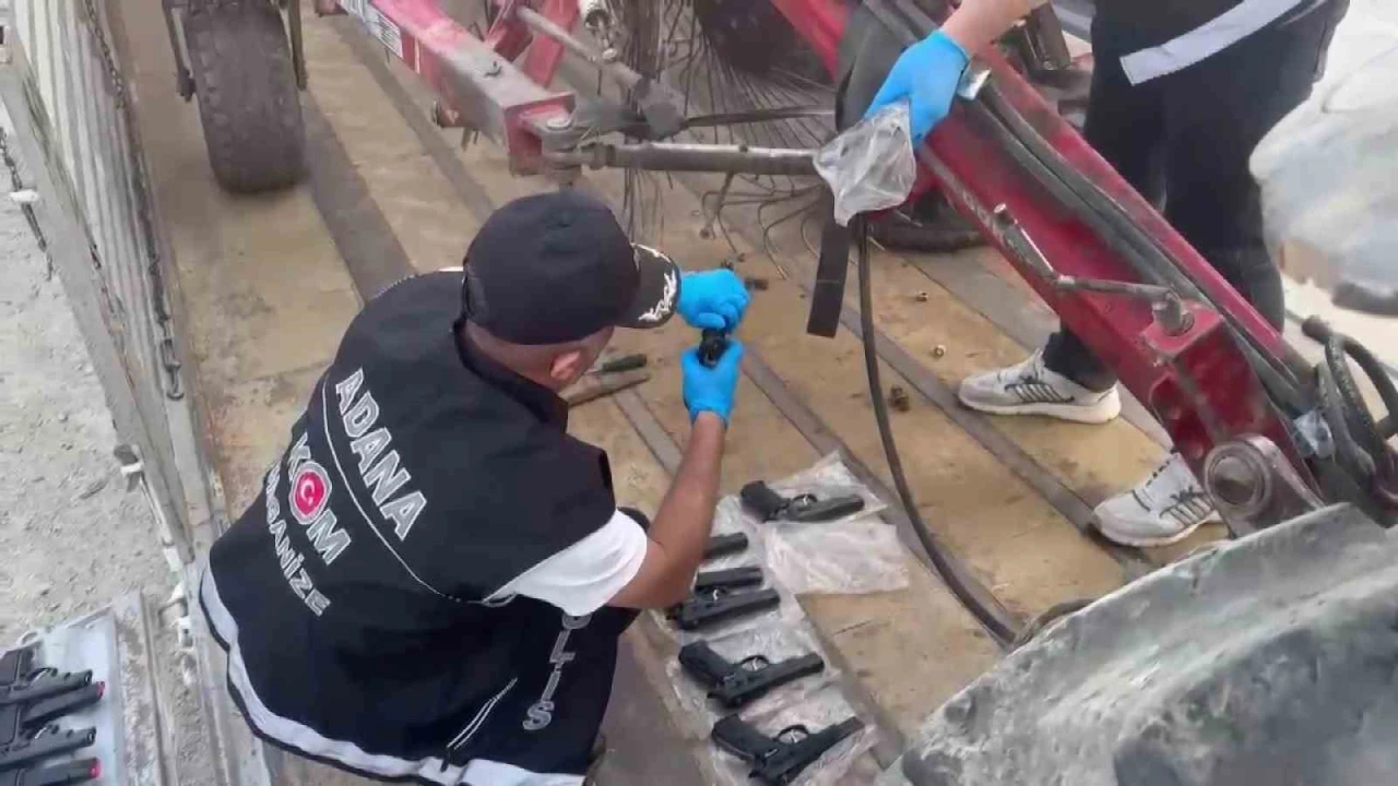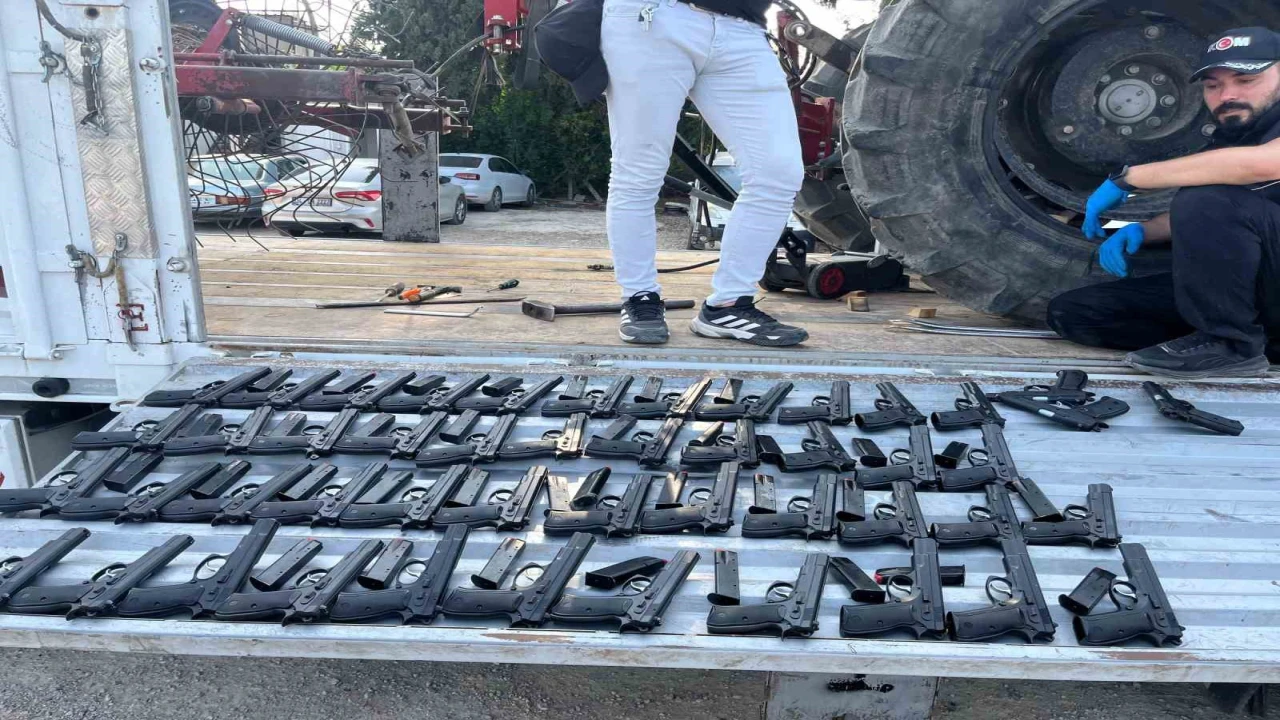 Adana’da polis ekiplerince durdurulan tırda traktör ve tarım ekipmanlarının içine gizlenmiş 420 adet tabanca ele geçirildi.