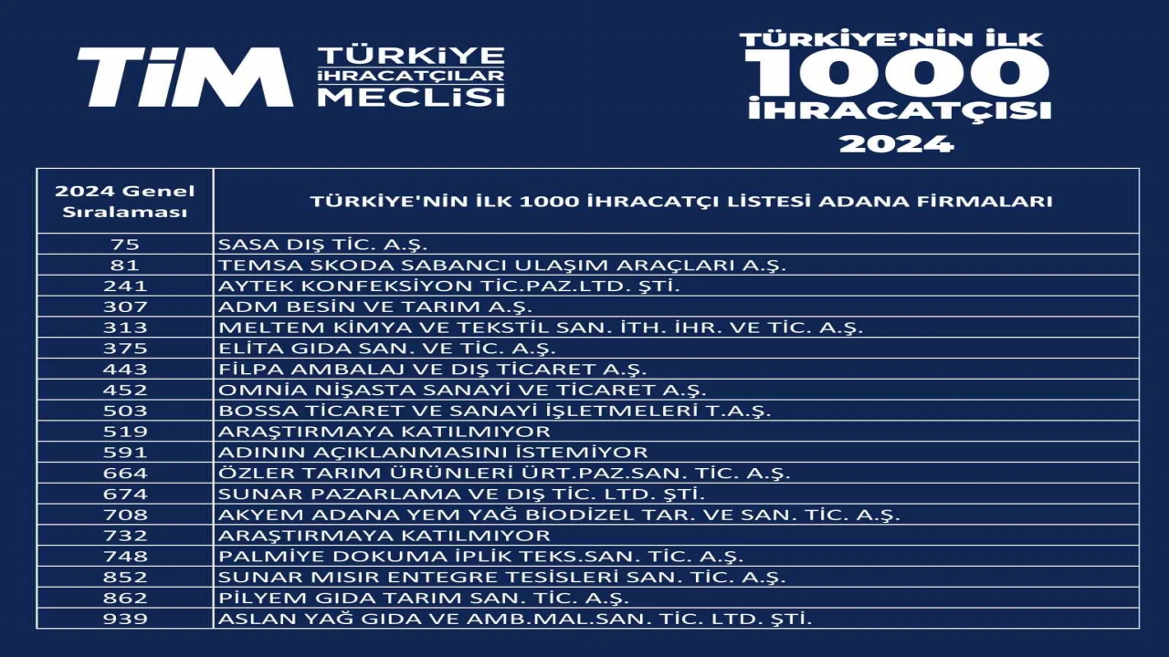 Adana Sanayi Odası Yönetim Kurulu Başkanı Zeki Kıvanç, Adana’dan 19 firmanın Türkiye’nin İlk 1000 İhracatçı Listesi’nde yer aldığını belirterek, "Adana’mızdan 2024 yılında 19 firma TİM İlk 1000 listesine girme başarısı gösterdi. TİM İlk 1000 Listesi’ne giren, ülkemizin üretimine, ihracatına ve istihdamına katkı sunan tüm firmalarımıza teşekkür ediyorum. Önümüzdeki dönemde Adana’dan daha çok firmanın bu prestijli listede yer alacağına inancımız tam" dedi.
