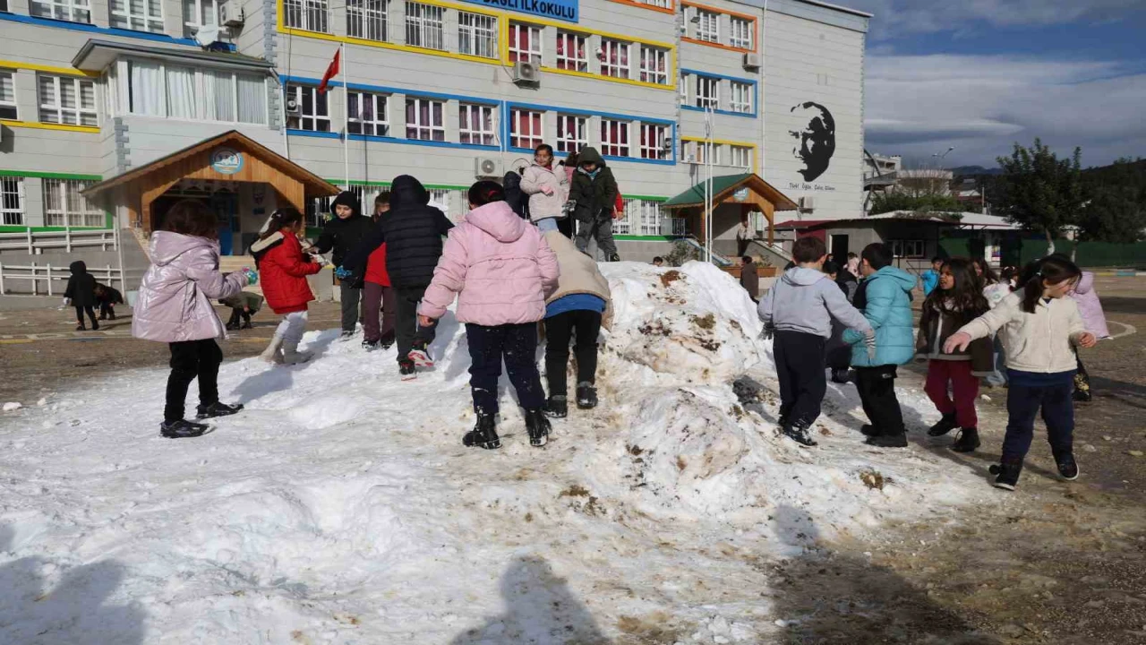 Torosların eteklerinden kamyonlarla getirilen kar Adana’nın Kozan ilçesinde bir okulun bahçesine döküldü, öğrenciler unutulmaz anlar yaşadı.