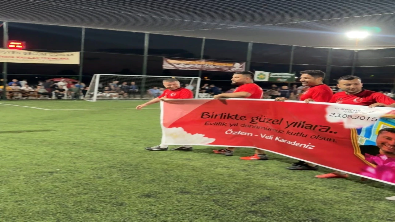 Adana’nın Kozan ilçesinde öğretmen olarak görev yapan Veli Karadeniz’in belediyenin düzenlediği turnuvadaki maçı evlilik yıl dönümüne denk geldi. Karadeniz, maçta sahaya takım arkadaşları ile "Birlikte evlilik yıl dönümüz kutlu olsun" yazılı pankartla çıktı. İki çocuk babası olan Karadeniz, eşine hazırladığı süprizle büyük alkış aldı.