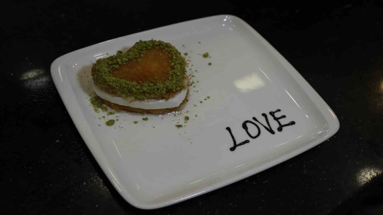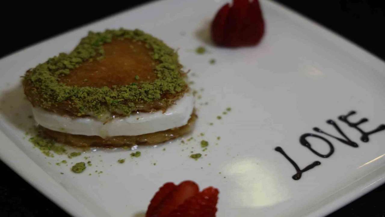 ADANALI TATLICI, 14 ŞUBAT SEVGİLİLER GÜNÜ'NE ÖZEL ÇİFTLERE KÜNEFEYİ 'KALP' ŞEKLİNDE SERVİS EDİYOR.