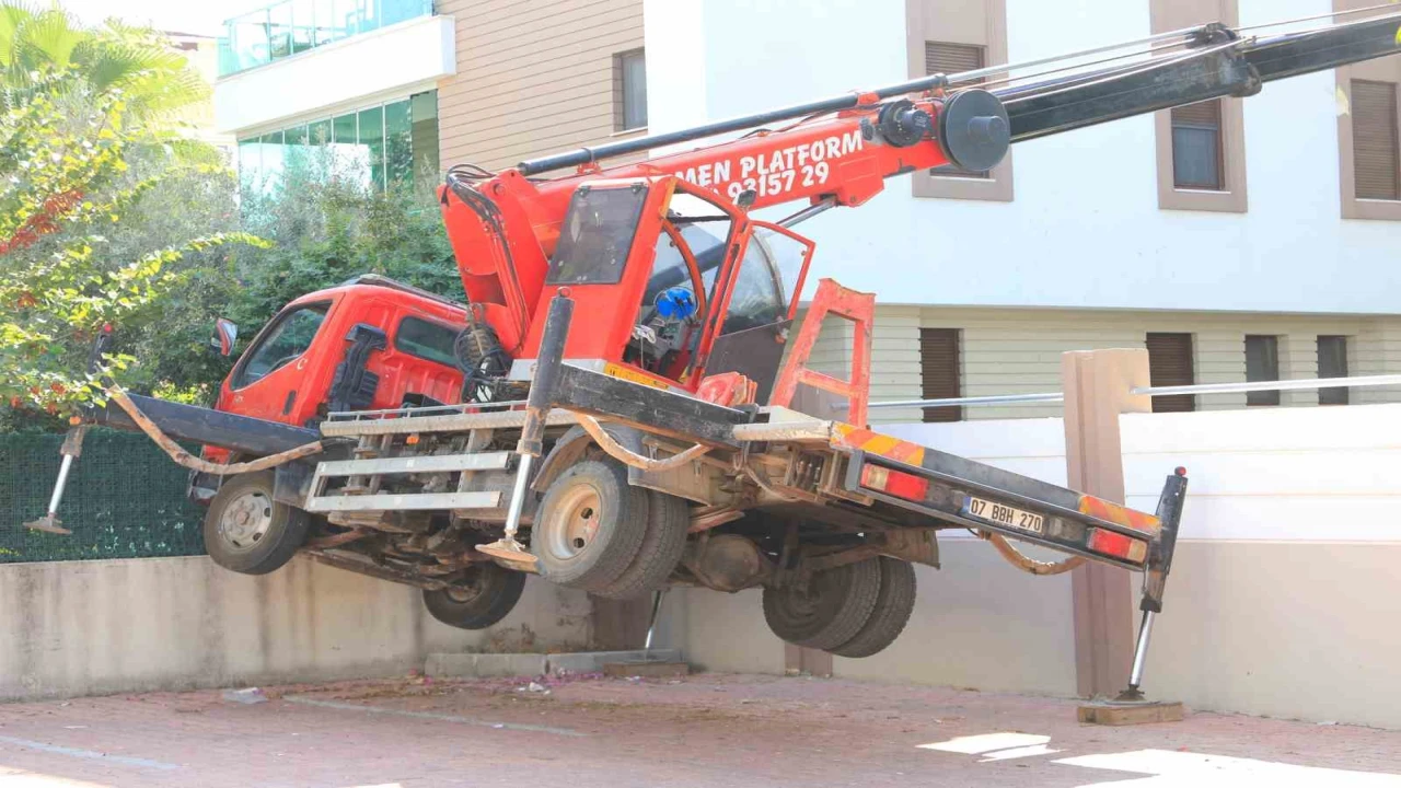 Olay, 14.30 sıralarında Muratpaşa ilçesi Çağlayan Mahallesi 2000 Sokak’ta bulunan bir sitede meydana geldi. Edinilen bilgiye göre, sitede bulunan palmiye ağaçlarının budanması için site yönetimi bir vinç kiraladı. Kiralanan 07 BBH 270 plakalı vinç, sitede gerekli önlemleri aldıktan sonra görevliyi sepete alarak çalışmaya başladı. Ali A. isimli site görevlisi motorlu testereyle palmiyeleri budadığı sırada vincin ayaklarından birisinin hidroliği boşalarak yan yattı. Vincin devrilmesini site duvarı engellerken, sepet ise palmiye ağacına takılı kaldı.