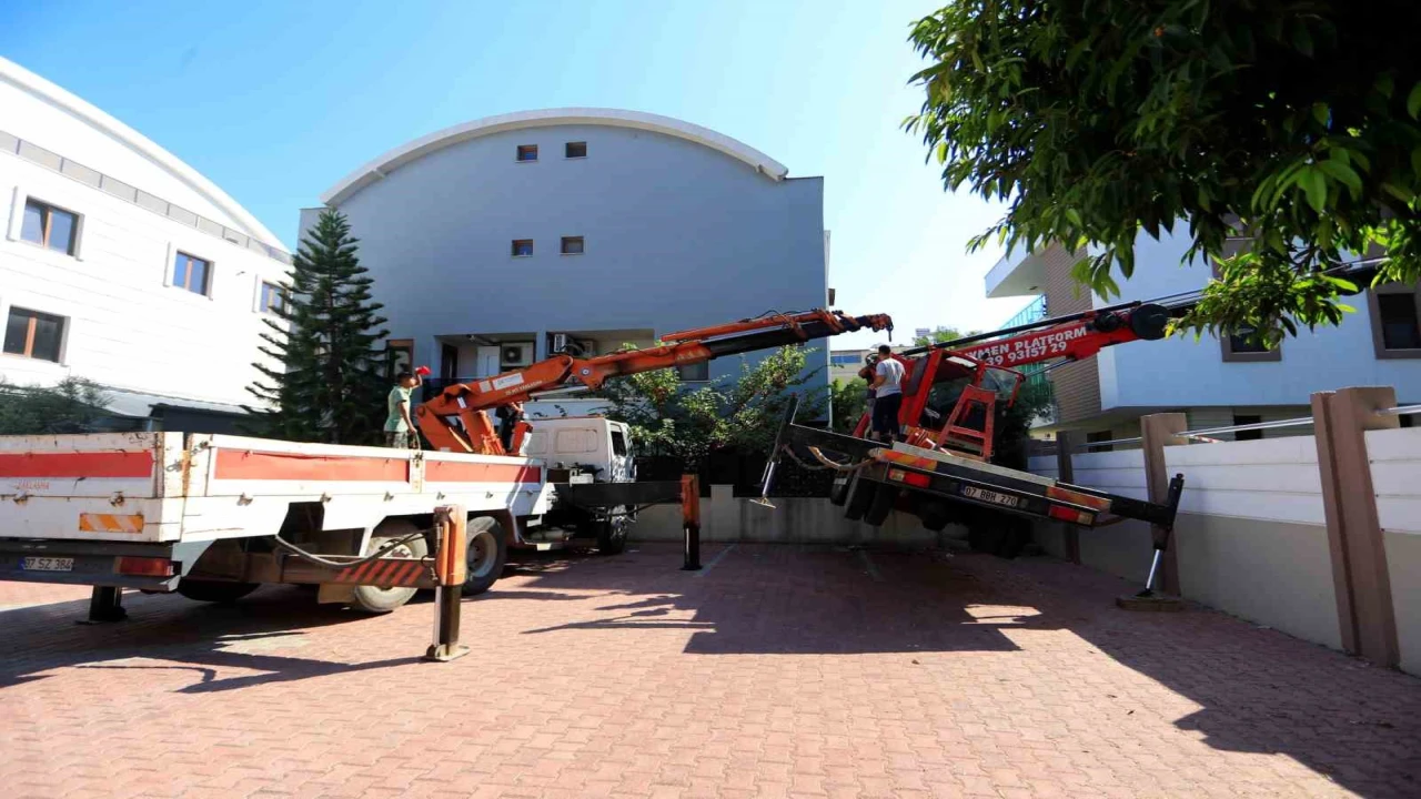 Antalya’da ağaç budaması için kiralanan ve hidroliği boşalan vinç yan yattı. Vincin devrilmesini sitenin duvarı engellerken, olay anında sepette ağaçları budamakta olan görevliyi, bulunduğu yerden itfaiye ekipleri kurtardı.