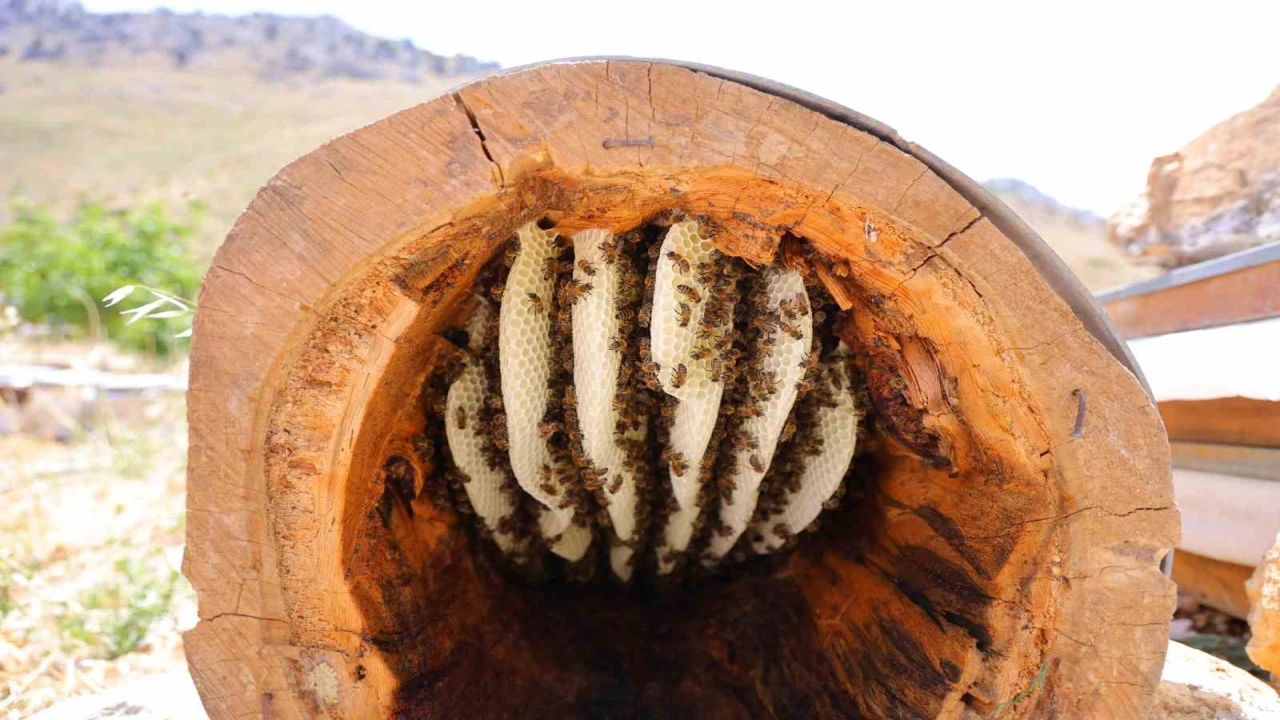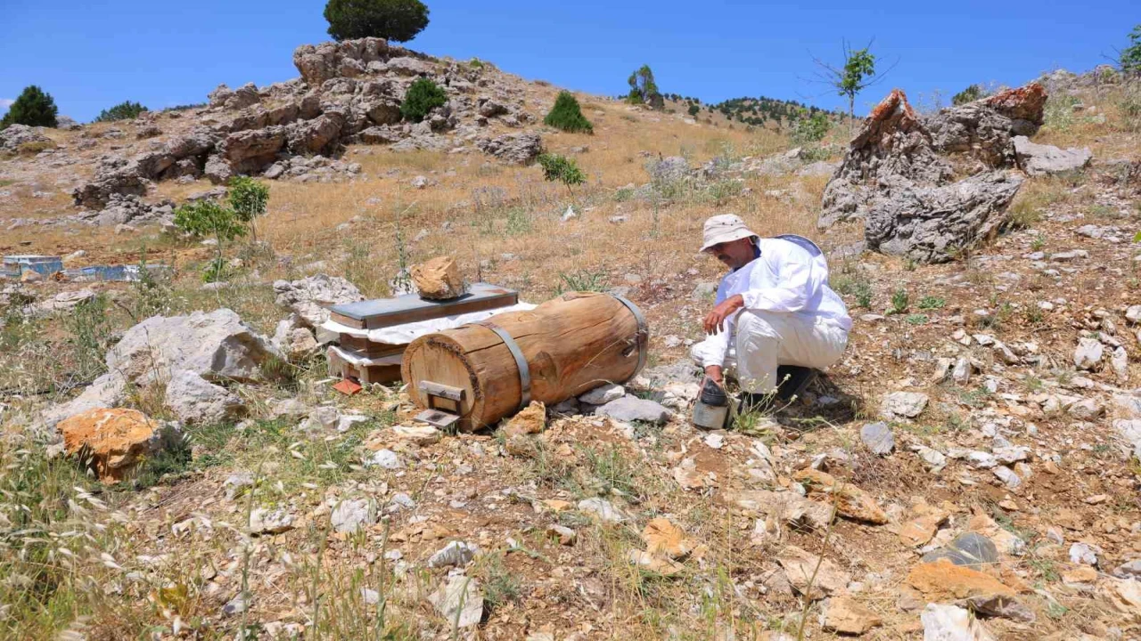 Kahramanmaraş’ın Engizek Yaylası’nda arıcılık yapan üretici, kovanlarının yanına bıraktığı boş bir ağaç kütüğünde doğal ortamda bal üretti.
