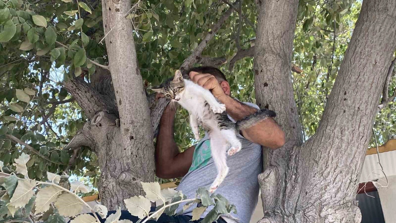 Ağaçta mahsur kalan yavru kedi vatandaşın dikkatiyle kurtarıldı