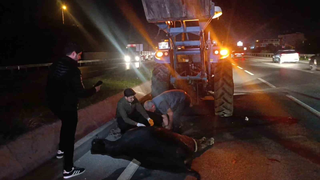 Antalya’nın Manavgat ilçesinde ağıldan kaçan ve D-400 kara yolunda trafiği birbirine katan inek, yoldan geçen araçların çarpması sonucu telef oldu.