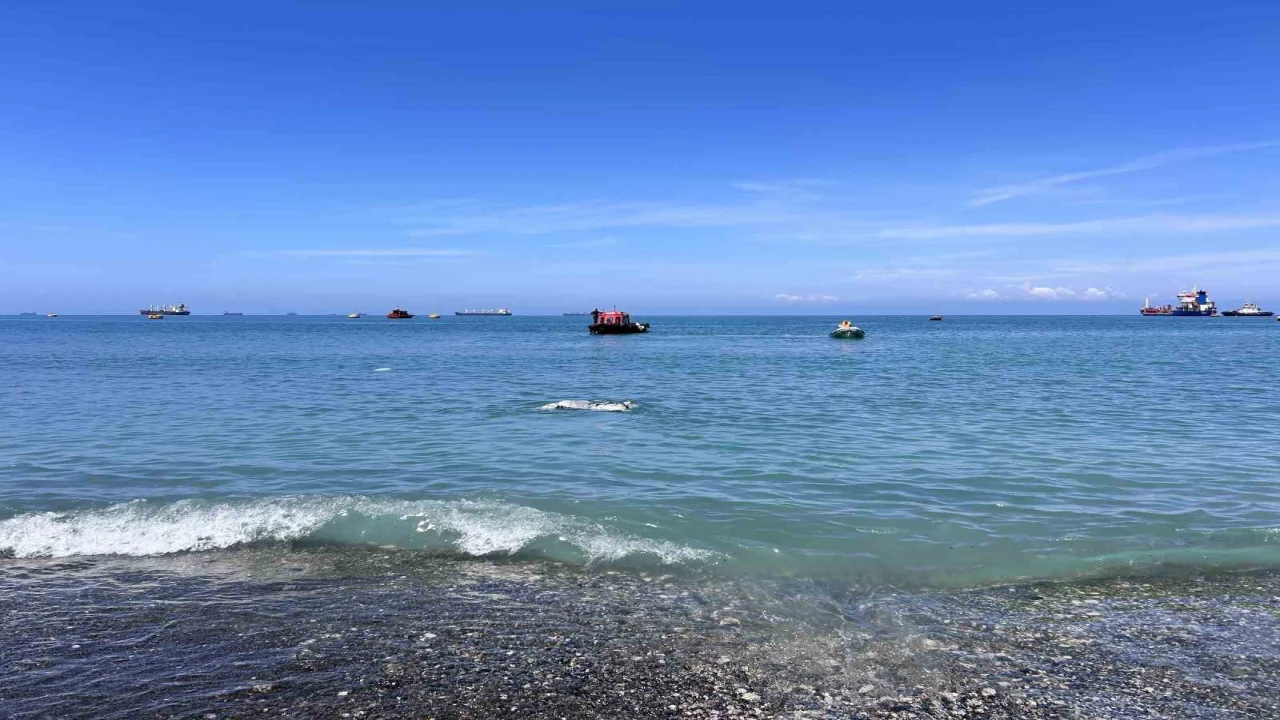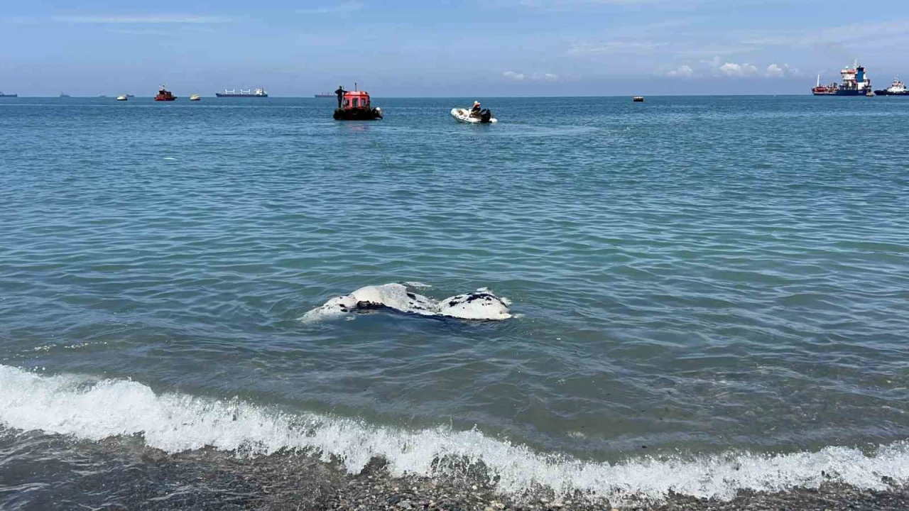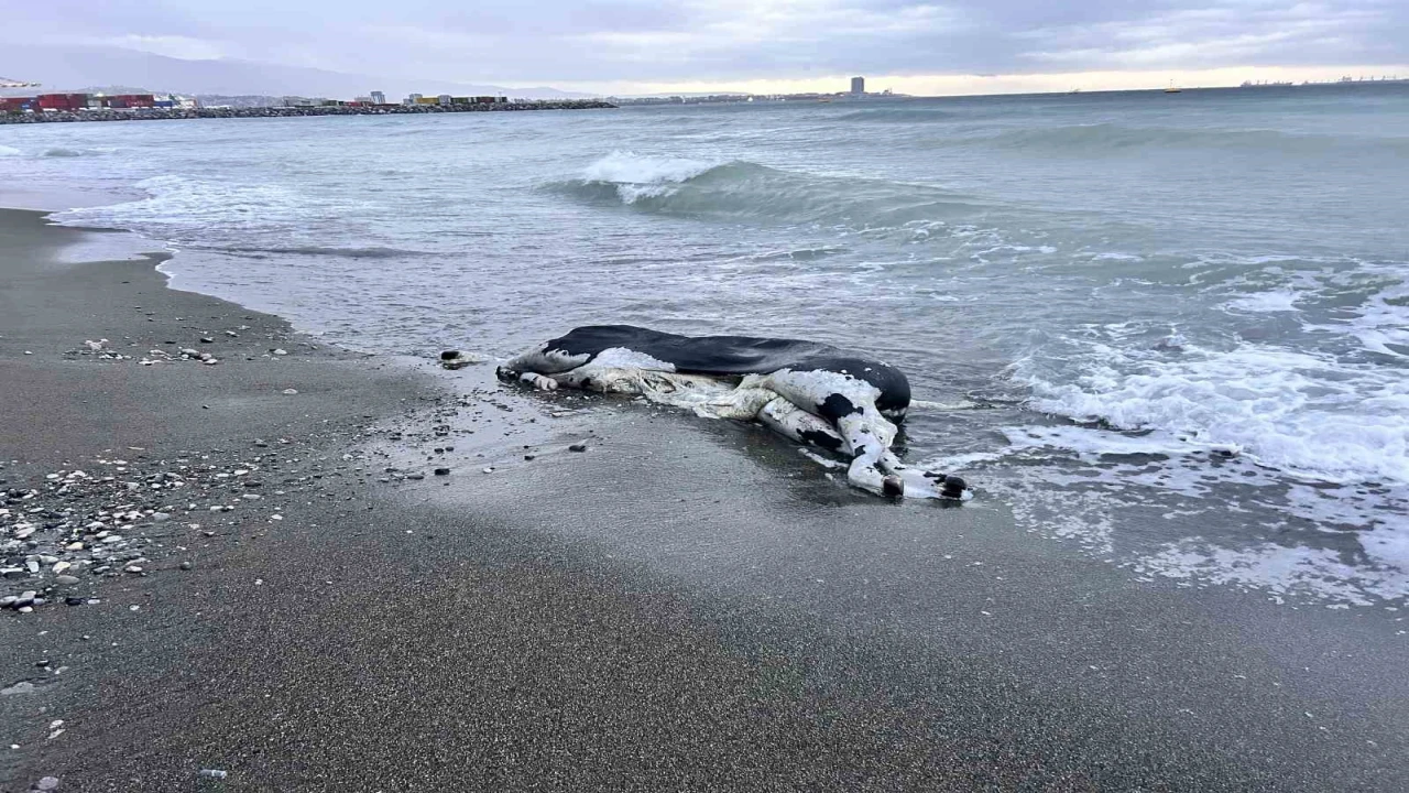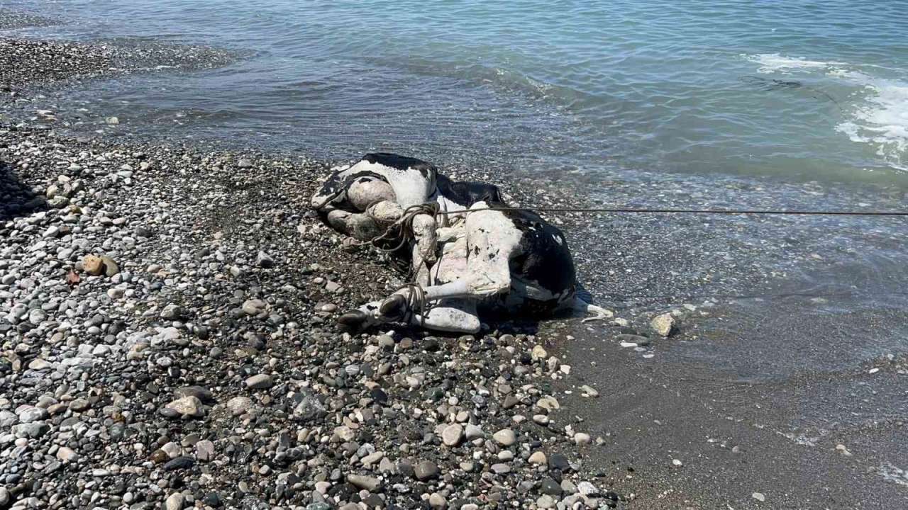 Hatay’da denize düşerek telef olan ve kıyıya vuran angus, ekipler tarafından kıyıdan kaldırıldı.