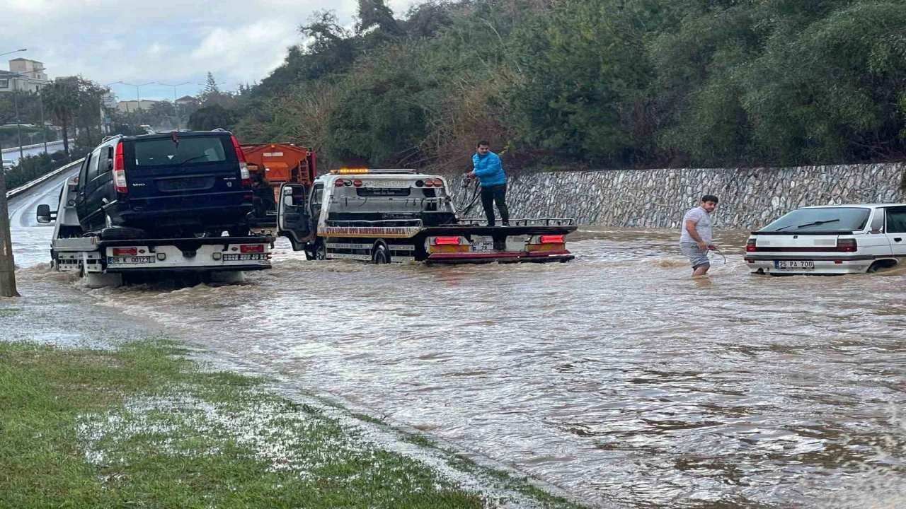 Antalya’nın Alanya ilçesinde etkili olan sağanakta su altında kalan D 400 karayolunda bazı araçlar mahsur kaldı.