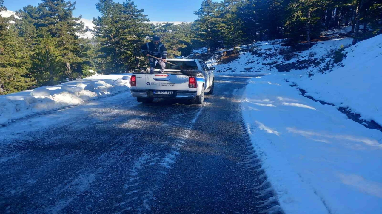 ANTALYA BÜYÜKŞEHİR BELEDİYESİ EKİPLERİ ALANYA’DA ULAŞIMIN AKSAMAMASI ARALIKSIZ ÇALIŞIYOR. EKİPLER, TAŞATAN YOLUNDA TUZLAMA ÇALIŞMASI YAPIYOR.