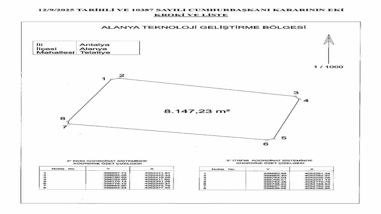 Alanya Alaaddin Keykubat Üniversitesi (ALKÜ) Rektörü Prof. Dr. Kenan Ahmet Türkdoğan’ın girişimleri sonucunda geçtiğimiz yıl ekim ayında Alanya TEKMER kurulmuştu. Rektör Türkdoğan, bu gelişmenin ardından Alanya ve bölgesinin teknolojide büyük adımlar atması adına Konaklı Kongre Merkezi’nin TEKNOPARK olması için girişimler başlatmıştı. Alanya için sevindiren karar, Resmî Gazete’de yayımlandı. 13 Eylül 2025 tarihli ve 33016 sayılı Resmî Gazete’de yayımlanan 10387 sayılı Cumhurbaşkanı Kararı doğrultusunda; 4691 sayılı Teknoloji Geliştirme Bölgeleri Kanunu kapsamında Alanya Teknoloji Geliştirme Bölgesi’nin kurulmasına karar verildi. Alanya Konaklı’daki 8 bin 147 metrekare Konaklı Kongre Merkezi’nin "Alanya Teknoloji Geliştirme Bölgesi" olması ilan edildi. Merkez, bu kararla birlikte TEKNOPARK olarak bilim ve teknolojiye büyük katkılar sunacak. Bu karar ile Alanya’da, teknoloji ve bilgi üretiminin önü tamamen açıldı.