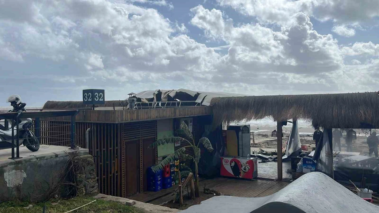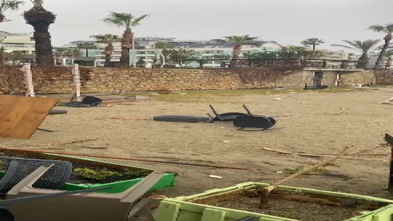 Alanya’da fırtına sonrası sahil kenarında faaliyet gösteren bir işletmenin çatısı zarar görürken, işletme önünde bulunan masa, sandalye ve çeşitli eşyalar hasar gördü. Sabahın ilk ışıklarıyla birlikte işletme sahipleri hasar tespit çalışmalarına başlarken, devrilen ve zarar gören eşyalar toparlandı. Fırtınadan etkilenen bir diğer nokta ise sahil kenarındaki spor kompleksi oldu. Kompleksin çatısında bulunan brandaların bir kısmı şiddetli rüzgar nedeniyle yırtılırken, bazı brandalarda ise ciddi hasar oluştu.