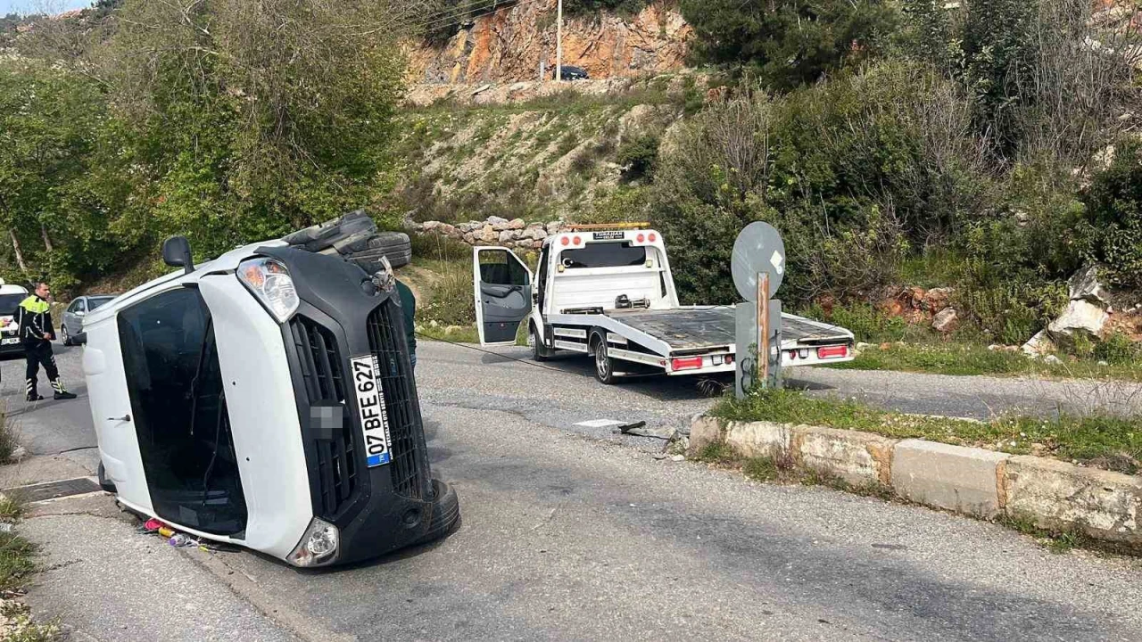 Antalya’nın Alanya ilçesinde kontrolden çıkan hafif ticari araç, önce bordür taşlarına çarptı, ardından çarpmanın etkisiyle devrilen otomobil sürücüsü kazada hafif yaralandı.