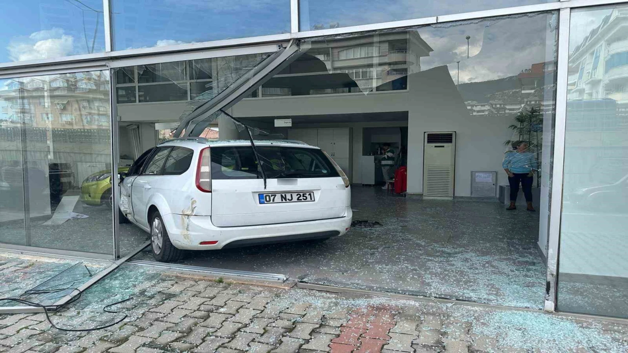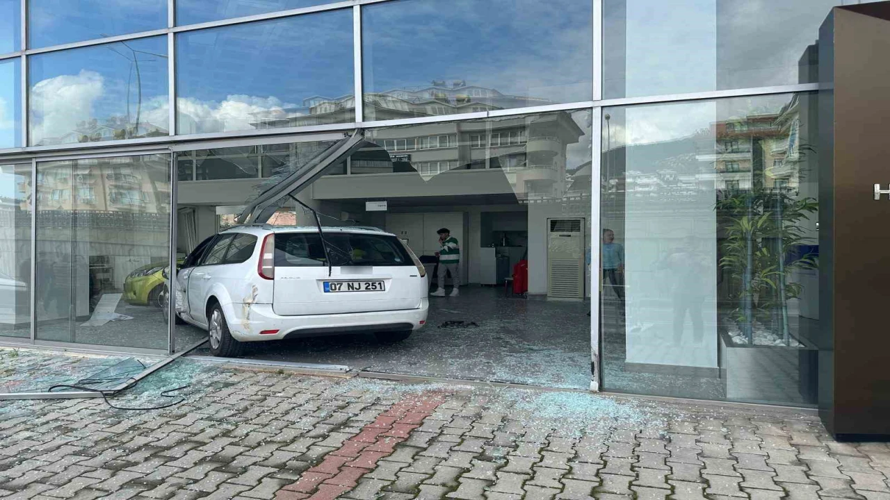 Antalya’nın Alanya ilçesinde şerit ihlali yaptıktan sonra direksiyon hakimiyetini kaybeden sürücü, otomobil satışı yapan mağazaya girdi.