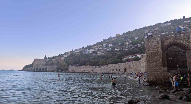 Antalya’nın Alanya ilçesinde, tarihi Kızılkule önünde bulunan plajda güneşli havayı fırsat bilen yerli ve yabancı turistler deniz keyfi yaptı.