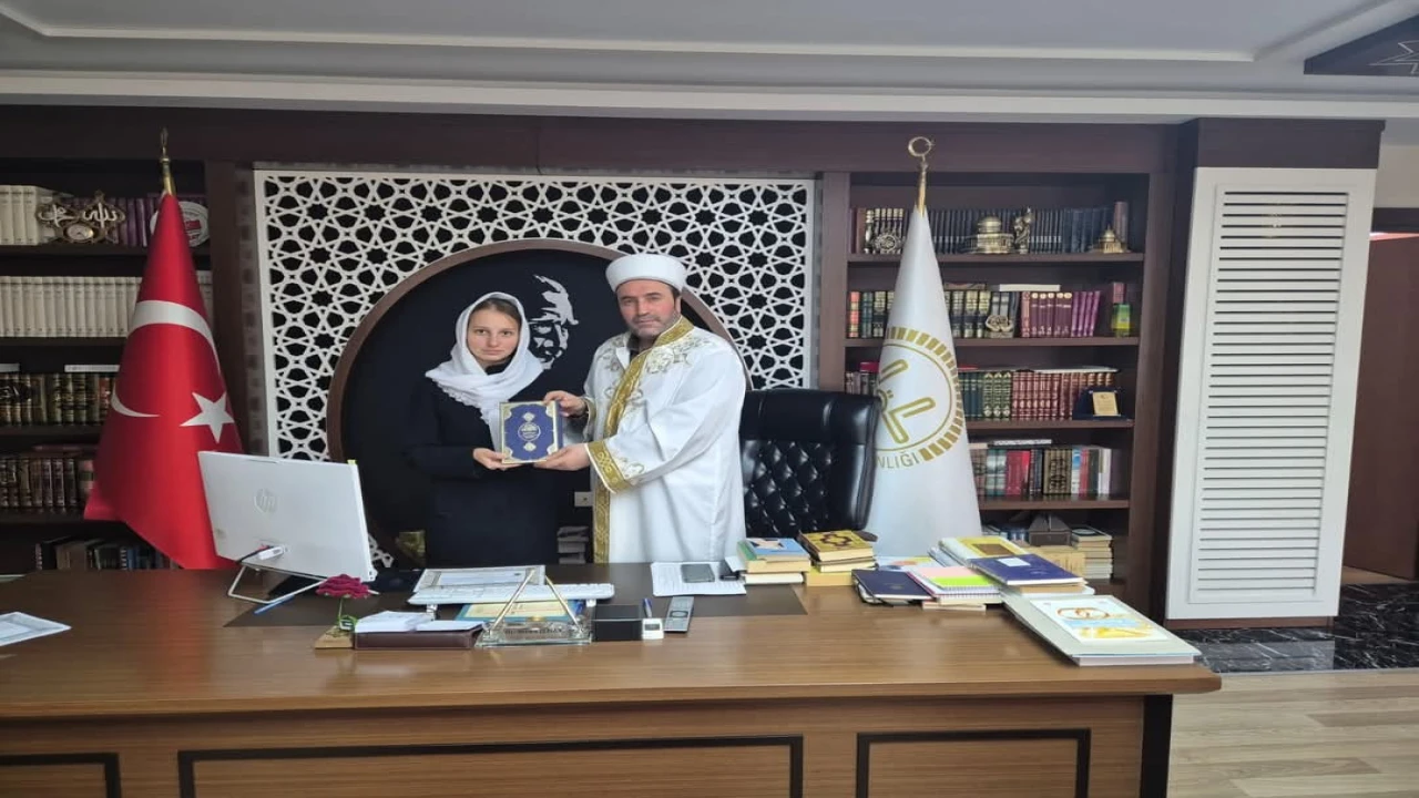 Alanya ilçe Müftüsü İhsan İlhan, İslamiyet’i seçen Ukrayna vatandaşı Anhelina Nesterenko’yu tebrik ederek "İhtida Belgesi" ile Kur’an-ı Kerim ve Diyanet İşleri Başkanlığı yayınlarından çıkan çeşitli kitaplar hediye etti.