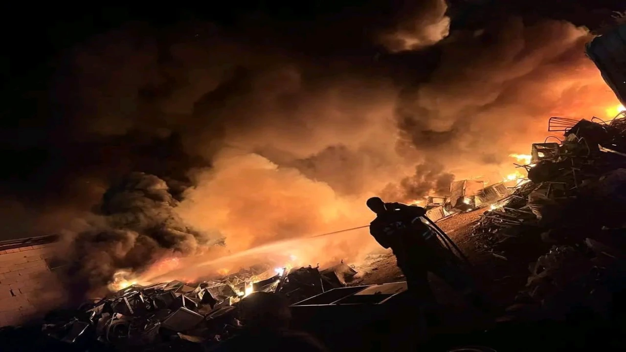 Alevlere teslim olan hurdalık alanda çıkan yangın geceyi aydınlattı