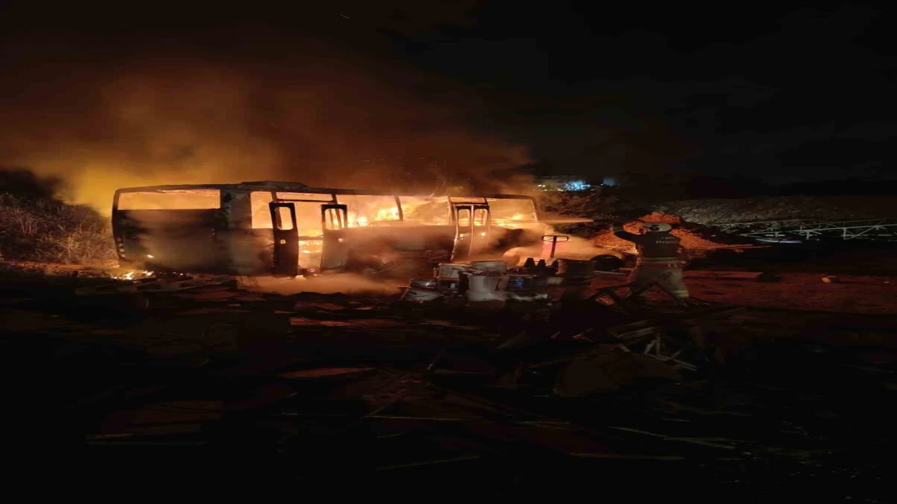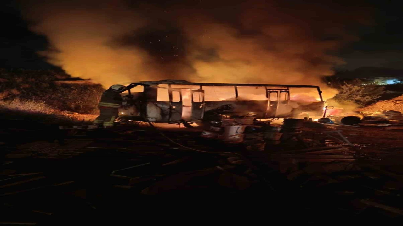 Hatay’da şantiye alanında alevlere teslim olan konteyner ve minibüs yanarak kullanılmaz hale geldi.