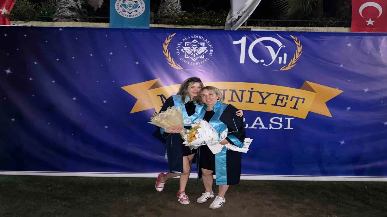 Alanya Alaaddin Keykubat Üniversitesi (ALKÜ) 2024-2025 Akademik Yılı Mezuniyet Töreni, bu yıl unutulmaz anlara sahne oldu. Törende, Tıp Fakültesi’nden mezun olan Ülkü Aslan ile Rahmi Büyükballı Meslek Yüksekokulu İşletme Yönetimi bölümünü birincilikle tamamlayan annesi Fatma Aslan, birlikte mezuniyet coşkusu yaşadı.