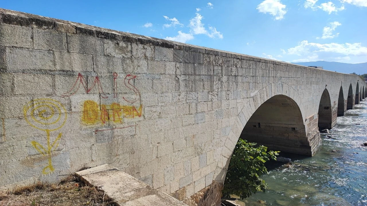 Adana’nın Yüreğir ilçesindeki Anadolu’nun ilk Roma köprüsü olarak bilinen Misis Köprüsüne sprey boya ile yazılama yapıldı.