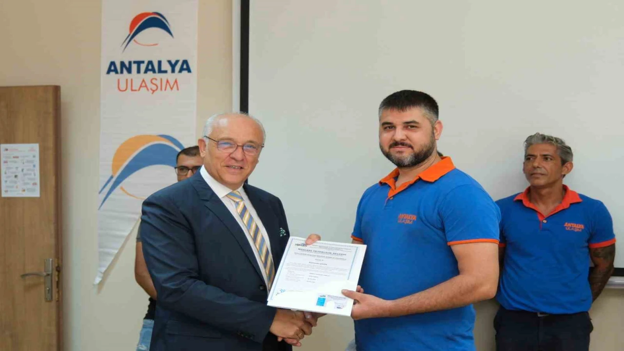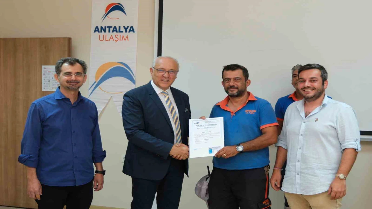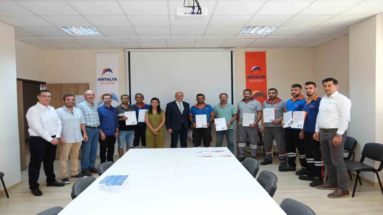 Antalya Ulaşım A.Ş. bünyesinde görev yapan 12 teknik personel, MYK belgesi alarak "Raylı Sistem Araçları Mekanik Bakım ve Onarımcısı" ile "Demiryolu Yol Yapım, Bakım ve Onarımcısı" unvanlarını kazandı. Eğitimlerini tamamlayan personelin sertifikaları, Genel Müdür Melih Dipova tarafından takdim edildi.