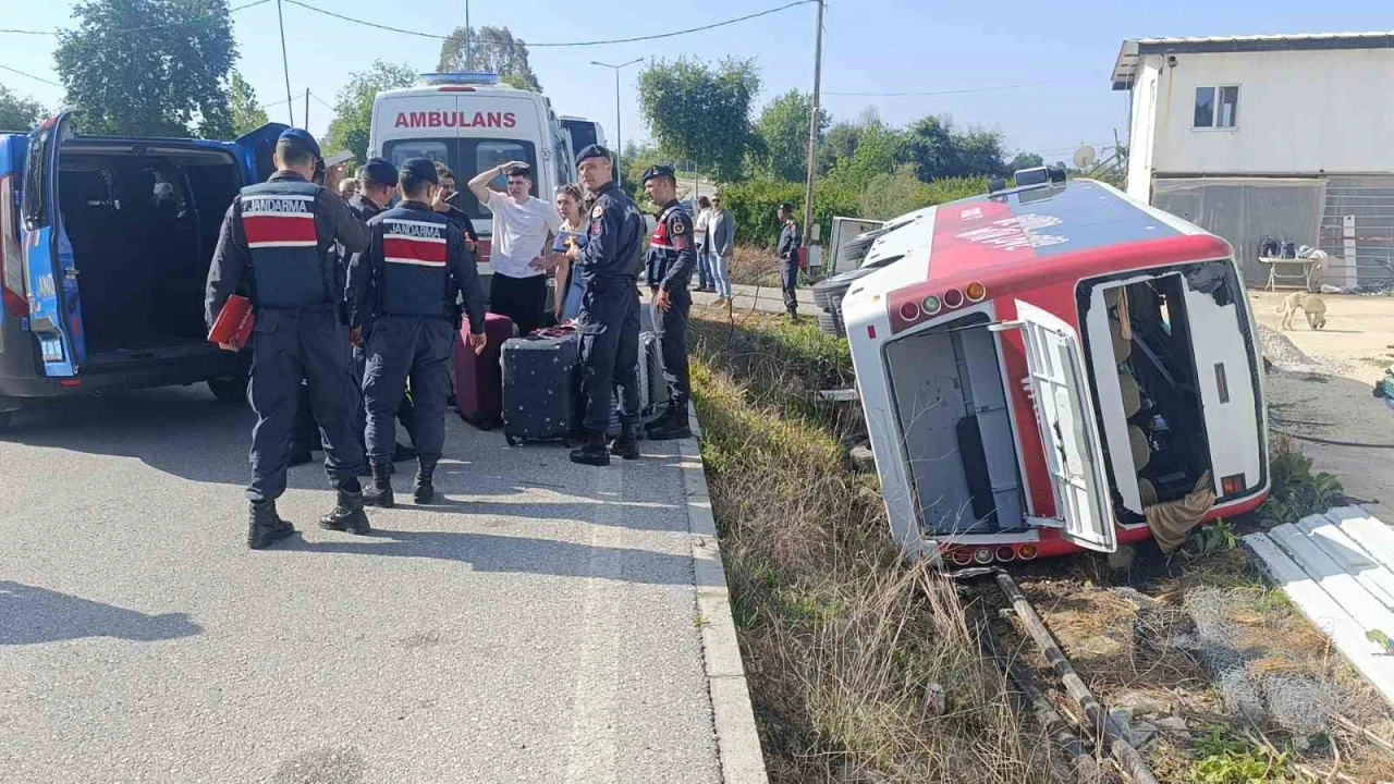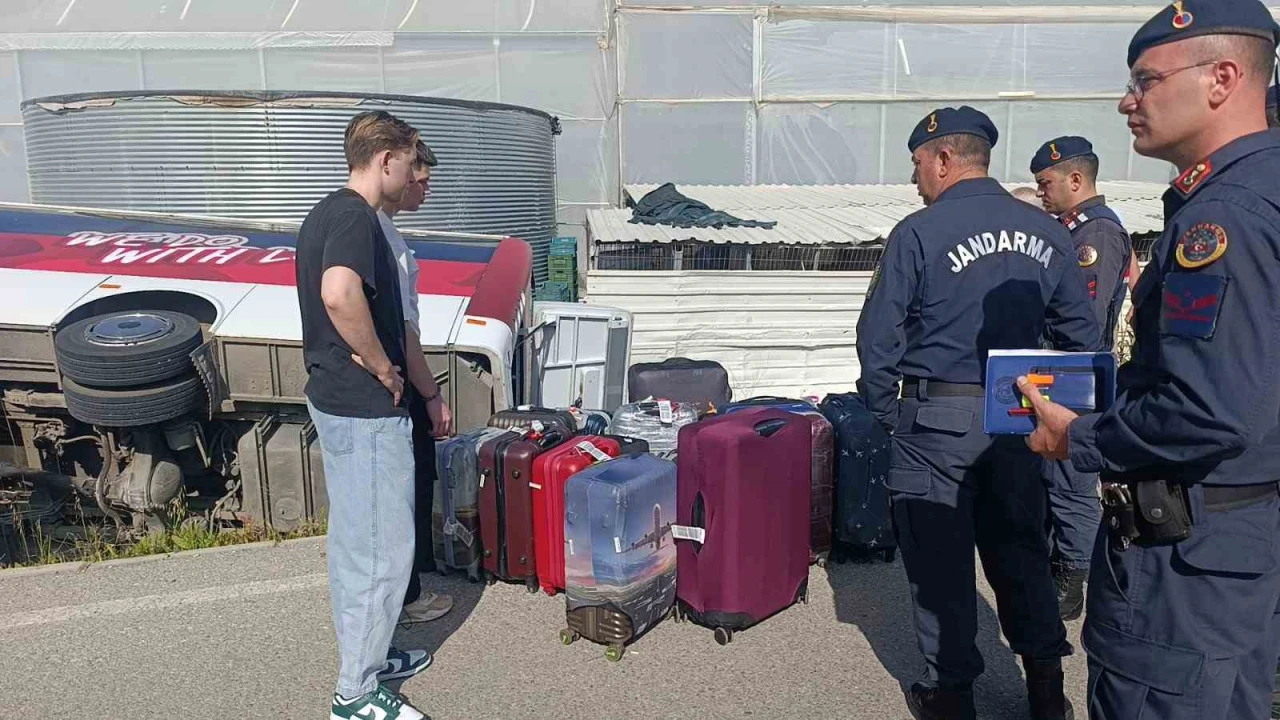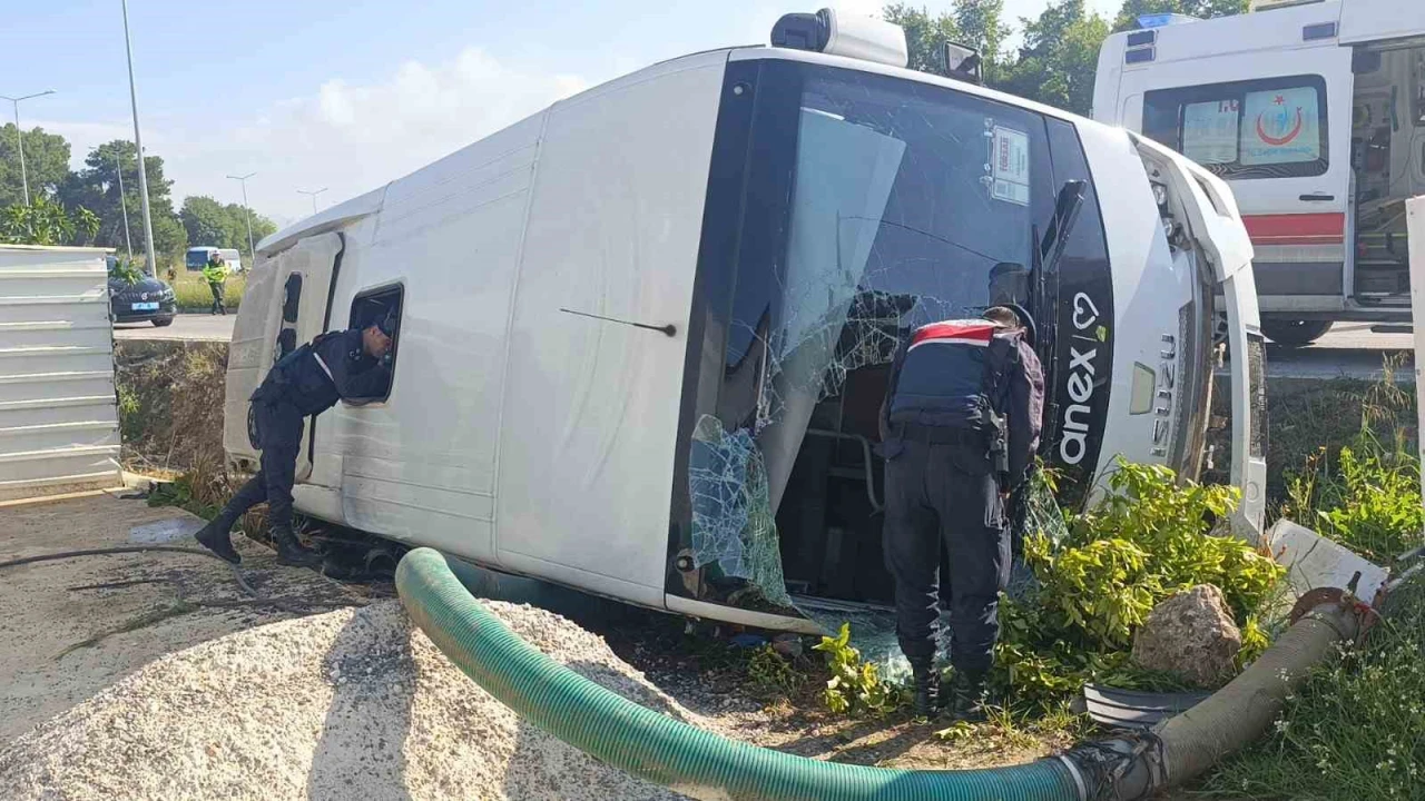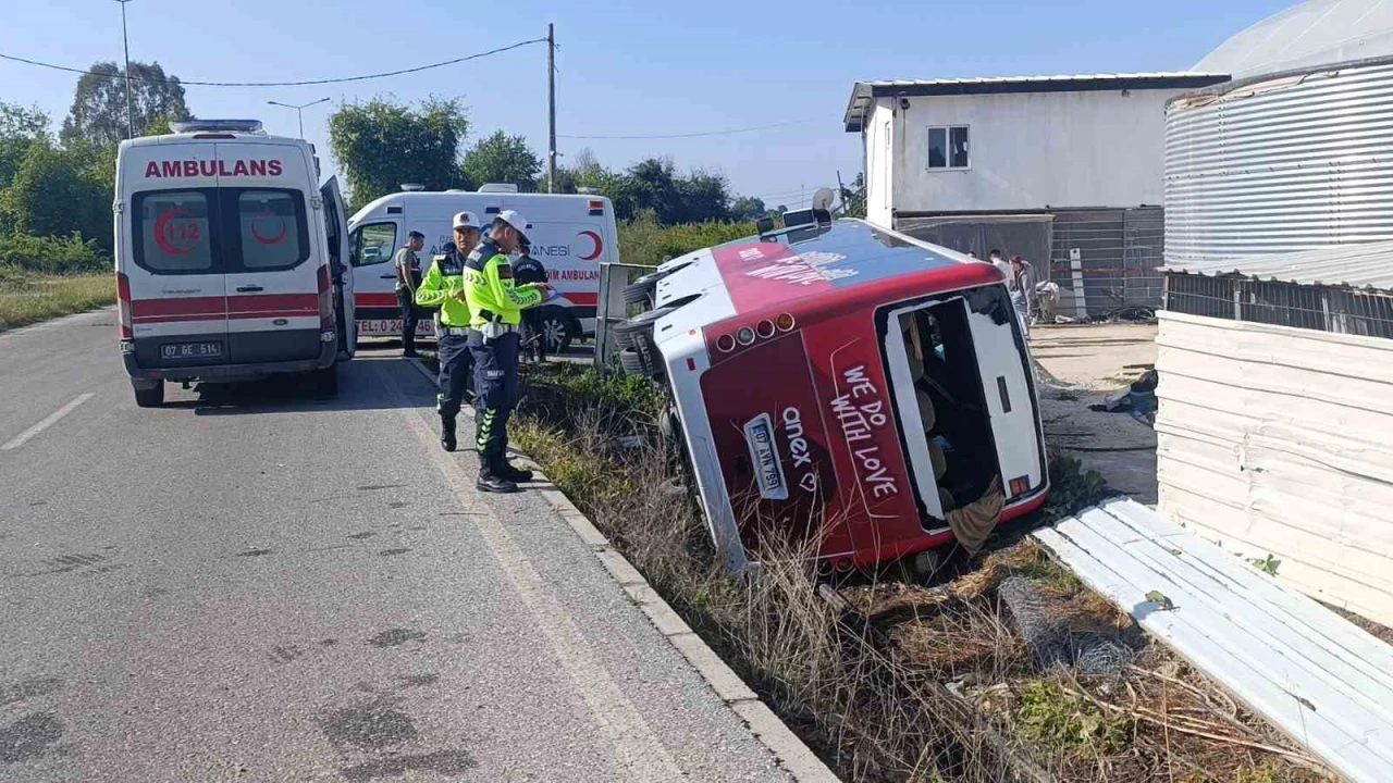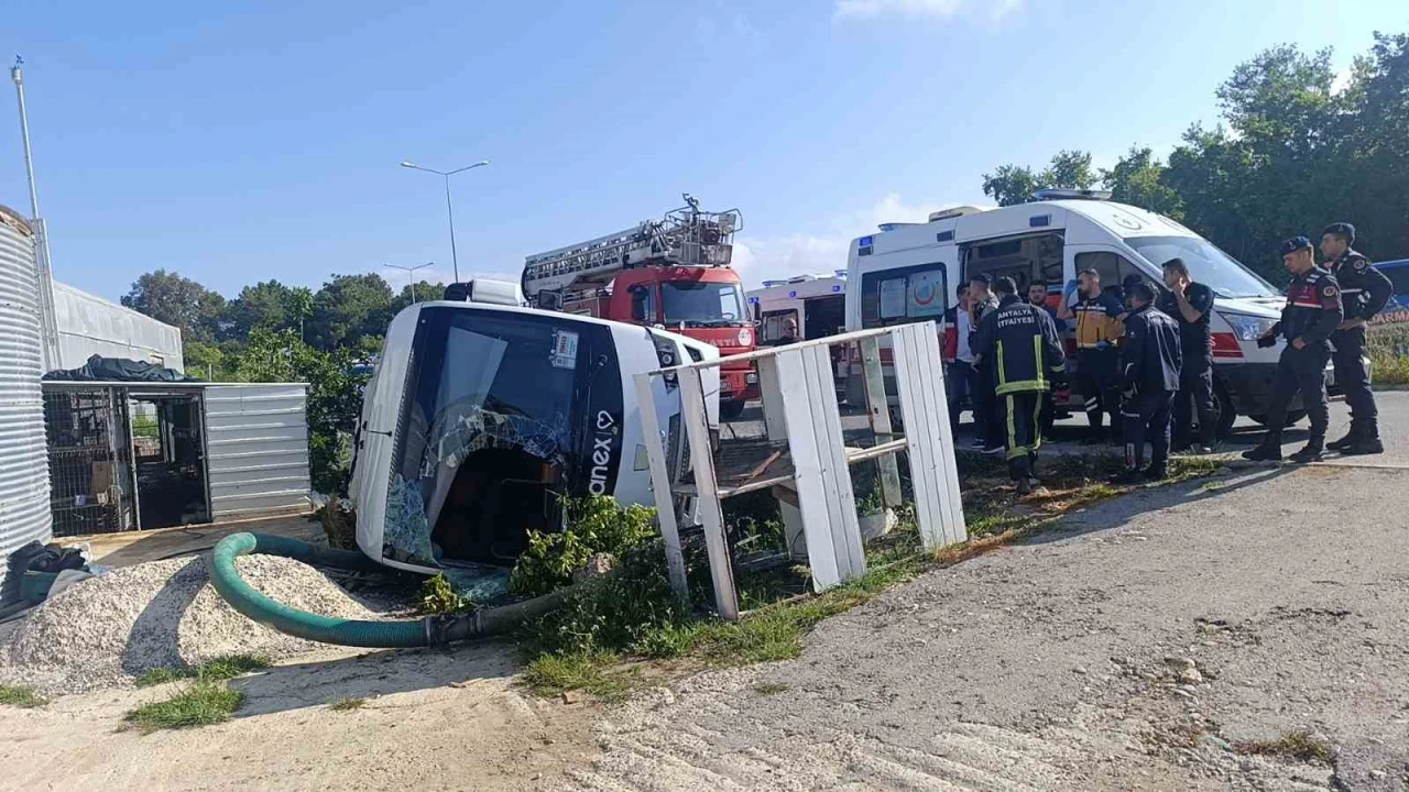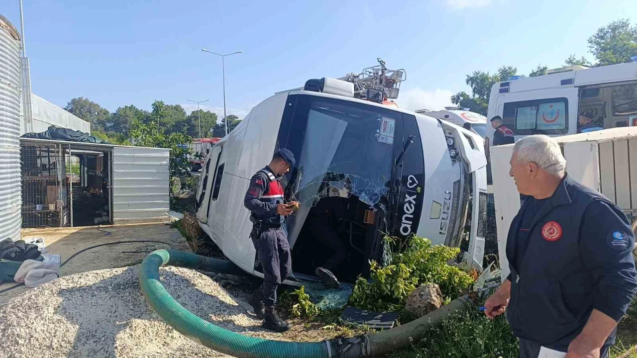 Kaza, sabah 08.00 sıralarında Antalya-Manavgat D-400 kara yolu Gündoğdu Yörük Mustafa Bey Bulvarı üzerinde meydana geldi. Edinilen bilgiye göre, Antalya Havalimanından aldığı Rus turistleri Manavgat’ta bulunan otellere getirmekte olan Fatih K.’nin kullandığı 07 AVN 799 plakalı tur midibüsü, Kımışcı mevkisinde sürücüsünün direksiyon hakimiyetini kaybetmesiyle şarampole devrildi. 112 Acil Çağrı Merkezine gelen ihbar üzerine olay yerine Antalya Büyükşehir Belediyesi İtfaiyesi Manavgat Birimi, 112 Sağlık, Manavgat İlçe Jandarma Komutanlığı Taşağıl Jandarma Karakolu ve Jandarma Trafik ekipleri sevk edildi. Manavgat İlçe Jandarma Komutanı Jan. Binbaşı Mustafa Deniz, yapılan çalışmaları olay yerinde takip etti.