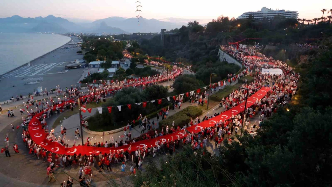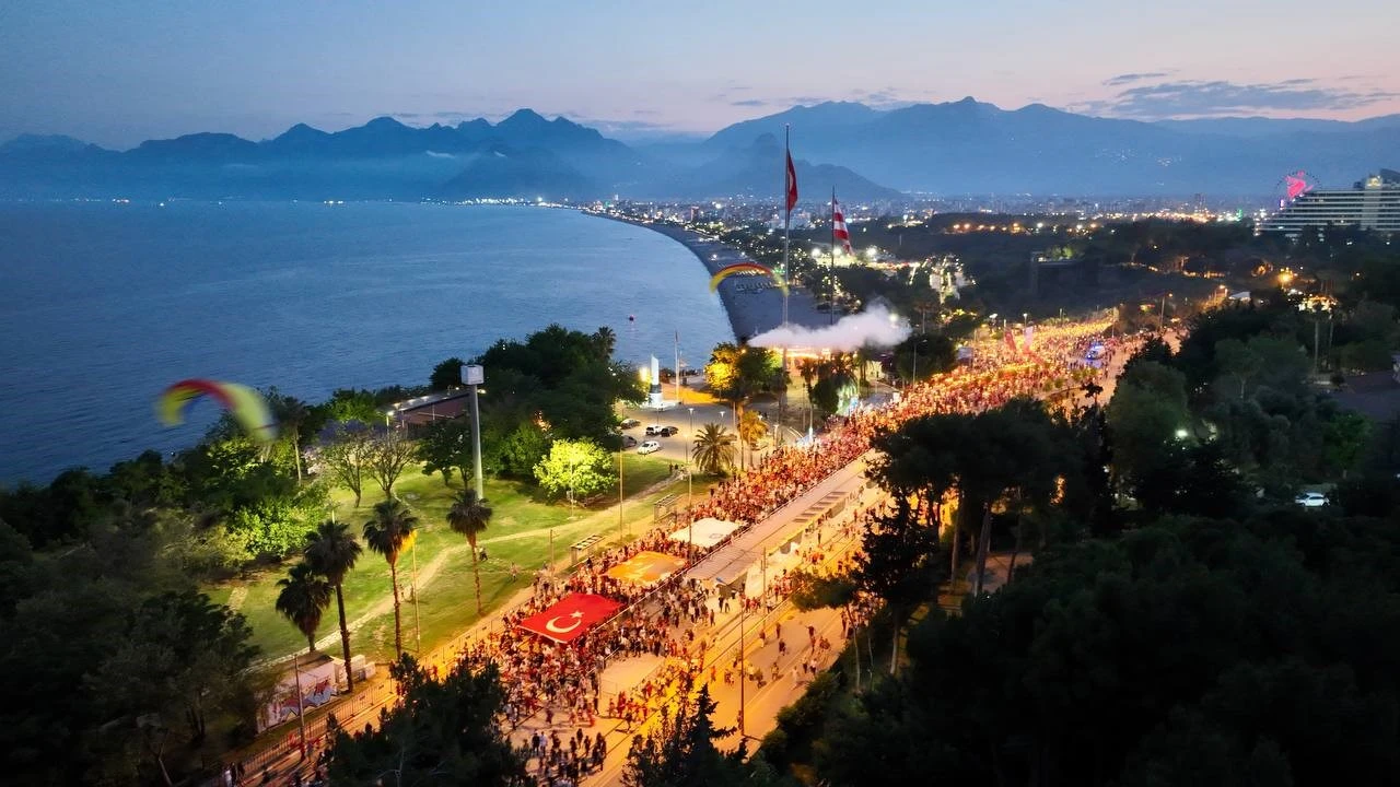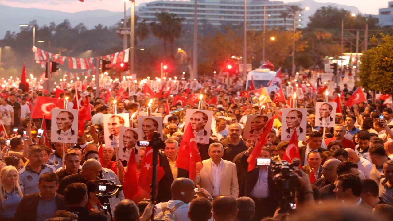 Binlerce kişi akşam saatlerinde ellerinde Türk bayrakları ve Atatürk fotoğrafları ile Fener Alayı’nın başlangıç noktası olan Konyaaltı Varyant’ta toplanmaya başladı. Antalya Valisi Hulusi Şahin, Antalya Büyükşehir Belediye Başkanı Muhittin Böcek, 3. Piyade Eğitim Tugay Komutanı Piyade Albay Hüseyin Yılmaz, Muratpaşa Kaymakamı İhsan Kara, STK temsilcileri ve çok sayıda vatandaşın katıldığı yürüyüşte 400 metrelik dev Türk bayrağı taşındı. Fener Alayı’na Türk Hava Kurumu’na bağlı paramotorcular gökyüzünden eşlik ederken, yürüyüş güzergahındaki apartmanların balkonlarındaki vatandaşlar da alkışlarıyla destekledi. 7’den 70’e binlerce Antalyalı, ellerinde Türk bayraklarıyla sloganlar ve marşlar eşliğinde Cumhuriyet Meydanı’na kadar yürüdü.