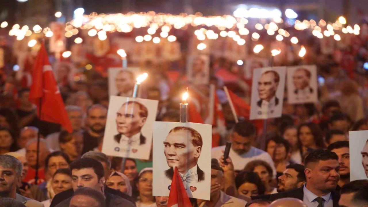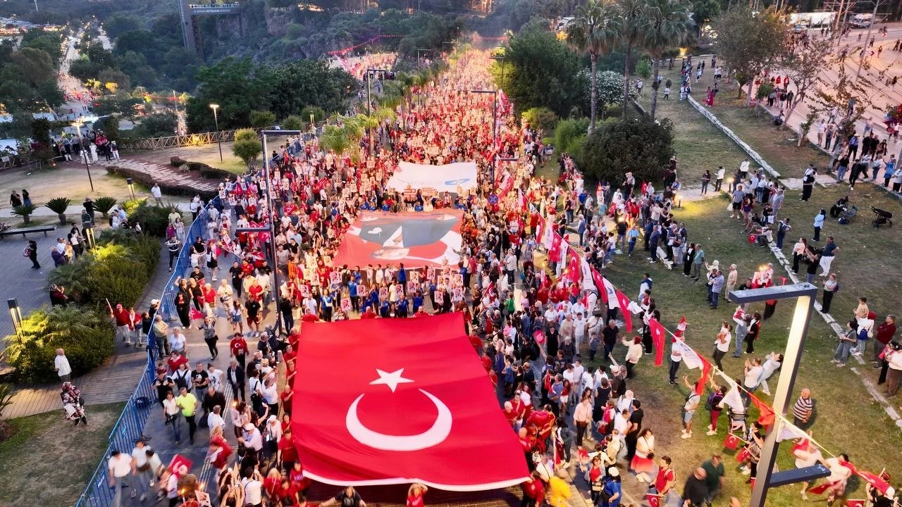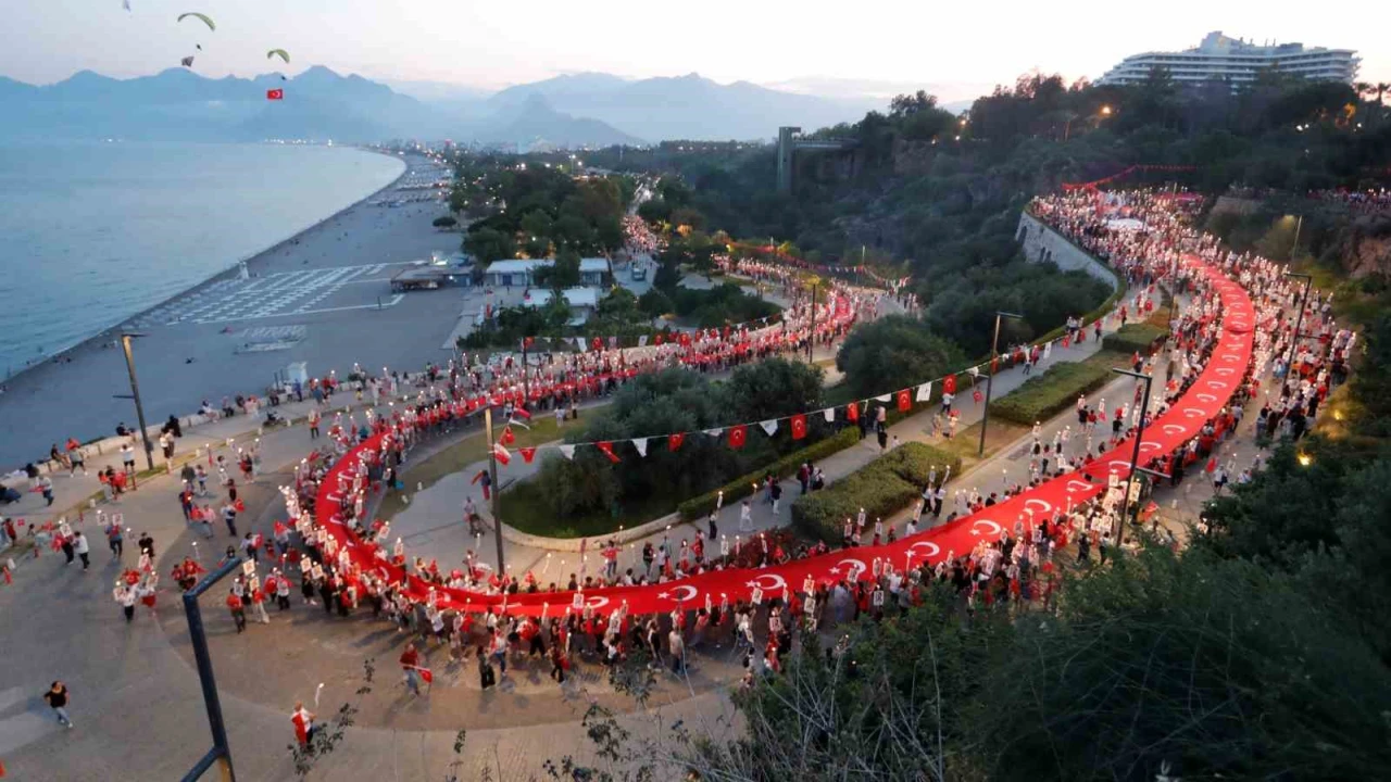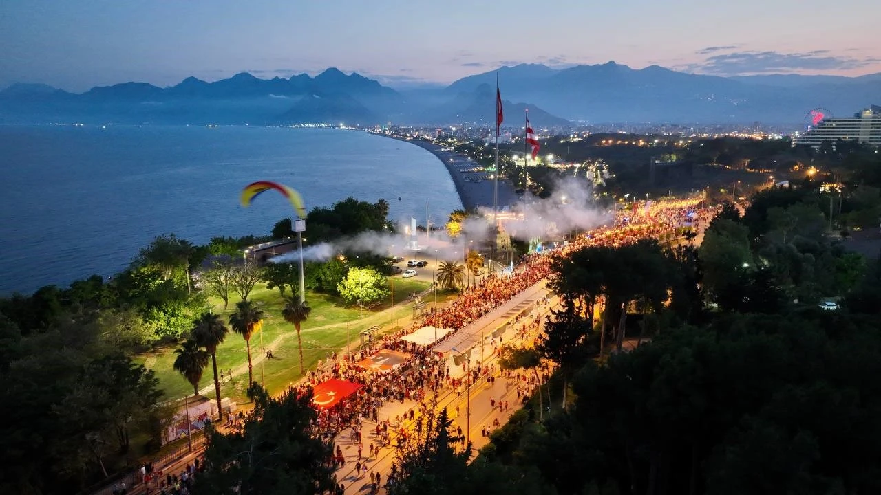 Binlerce kişi akşam saatlerinde ellerinde Türk bayrakları ve Atatürk fotoğrafları ile Fener Alayı’nın başlangıç noktası olan Konyaaltı Varyant’ta toplanmaya başladı. Antalya Valisi Hulusi Şahin, Antalya Büyükşehir Belediye Başkanı Muhittin Böcek, 3. Piyade Eğitim Tugay Komutanı Piyade Albay Hüseyin Yılmaz, Muratpaşa Kaymakamı İhsan Kara, STK temsilcileri ve çok sayıda vatandaşın katıldığı yürüyüşte 400 metrelik dev Türk bayrağı taşındı. Fener Alayı’na Türk Hava Kurumu’na bağlı paramotorcular gökyüzünden eşlik ederken, yürüyüş güzergahındaki apartmanların balkonlarındaki vatandaşlar da alkışlarıyla destekledi. 7’den 70’e binlerce Antalyalı, ellerinde Türk bayraklarıyla sloganlar ve marşlar eşliğinde Cumhuriyet Meydanı’na kadar yürüdü.