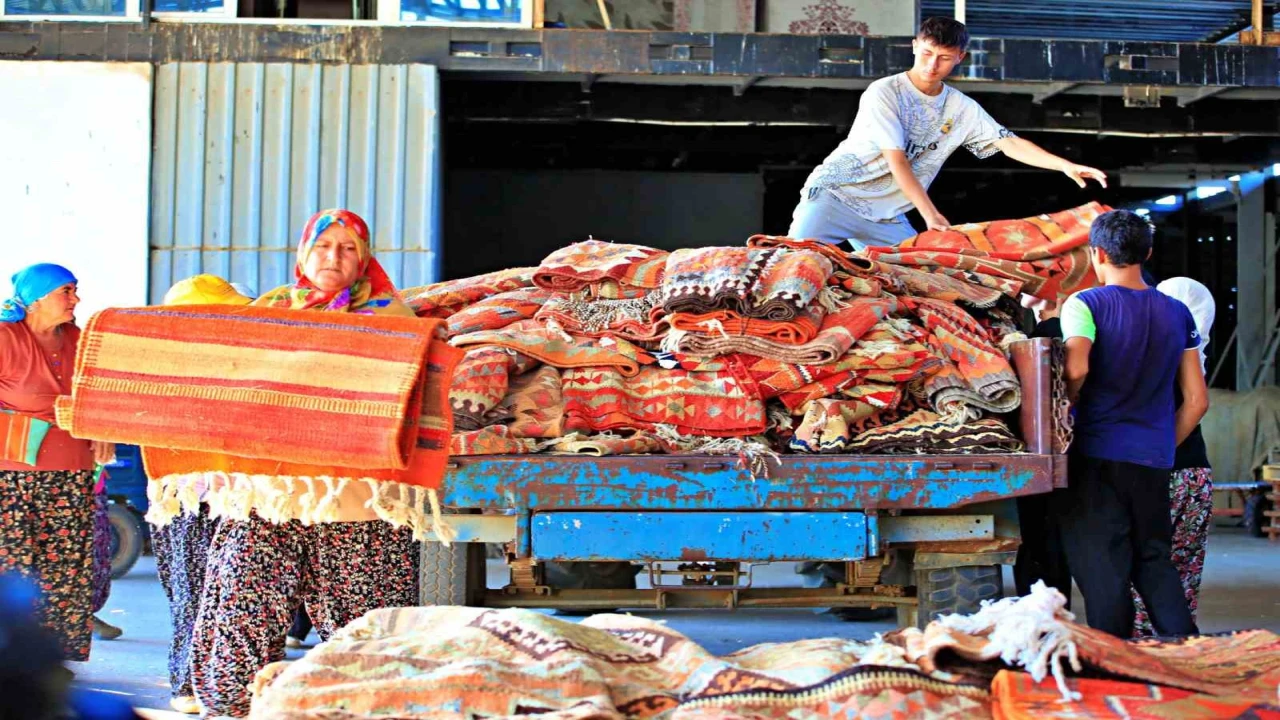 Antalya’da kışın buğday ekilen tarlalara yaz aylarında Türkiye’nin dört bir yanından getirilerek serilen binlerce el dokuması halı ve kilim renklerinin güneşle pastelleşmesinin ardından hasat edildi. Toplanan halılar depoya alınıp tozlardan arınması için yıkandıktan sonra müşterilere teslim ediliyor.