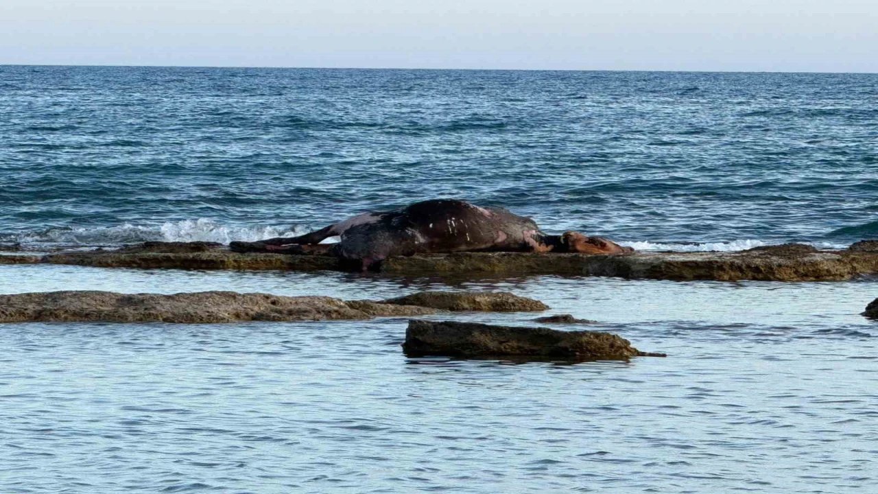 Antalya’nın Manavgat ilçesinde denize girmek isteyen vatandaşlar, denizin ortasındaki kayalıkların üzerinde inek leşi görünce durumu yetkililere bildirdiler.