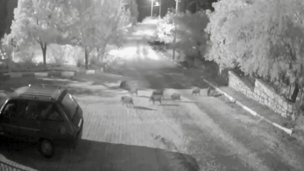 Gece saat 01.30 sıralarında mahalle arasında dolaşan domuz sürüsü, güvenlik kameralarına yansıdı. Görüntülerde domuzların uzun süre mahalle içinde dolaşıp yiyecek aradıkları, daha sonra ormanlık alana doğru uzaklaştıkları görüldü.