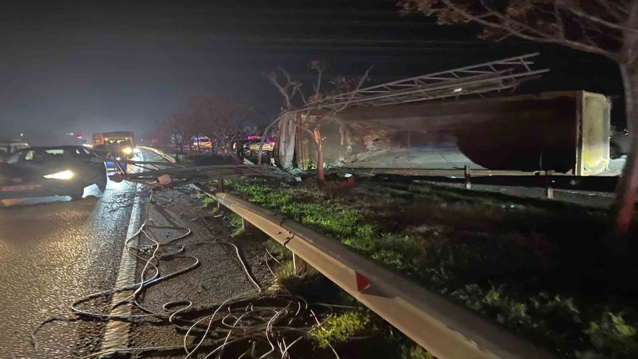Antalya’nın Serik ilçesinde dorsesi EDS sisteminin bulunduğu direğe çarpan tır devrildi. Kopan demirler, kamyonun kupasına ve otomobile çarptı. Kazada 1’i ağır 2 kişi yaralandı.