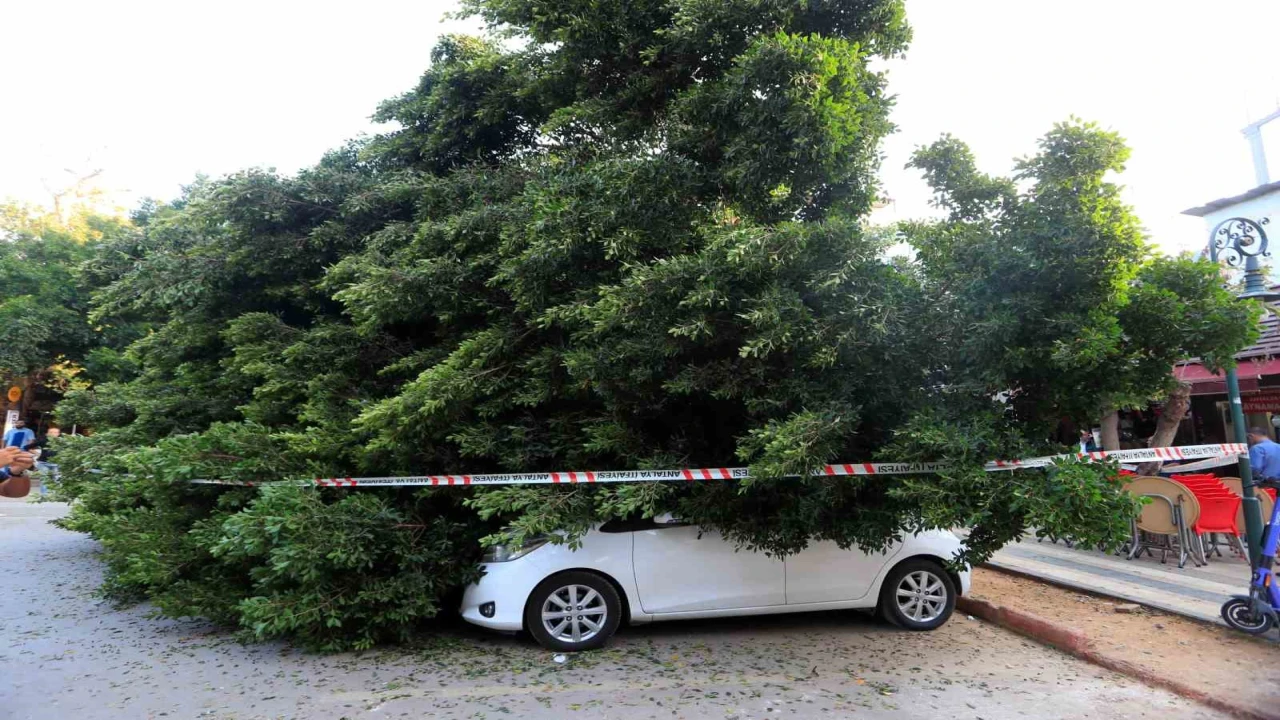 Antalya’da kaldırım üzerinde bulunan ağaç park halindeki araçların üzerine devrildi. 5 araçta büyük çapta maddi hasar meydana gelirken, bir kişi ağaç dallarının altında kalmakta son anda kurtuldu.