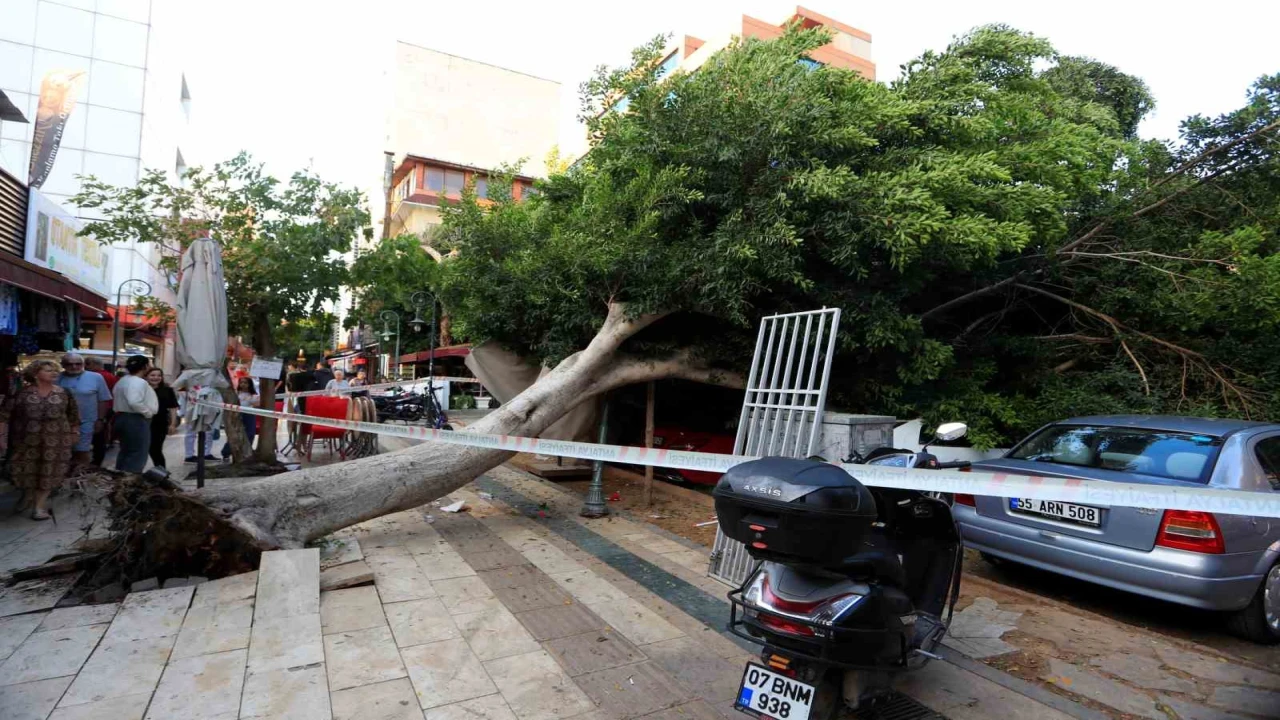 Olay, saat 16.45 sıralarında Muratpaşa ilçesi Sinan Mahallesi 1251 sokak üzerinde bulunan bir otoparkta meydana geldi. Edinilen bilgiye göre, sokak üzerinde kaldırımda bulunan kökleri zayıfladığı görülen ağaç devrildi. Büyük bir gürültüyle hemen bitişiğinde bulunan açık otoparka devrilen ağacın altında park halinde bulunan 5 araç kaldı. İhbar üzerine olay yerine polis ve Antalya Büyükşehir Belediyesi İtfaiye Daire Başkanlığı’na bağlı ekip sevk edildi. Polis ve itfaiye ekipleri devrilen ağacın altında kalan araçlarda ve dalların altında herhangi bir vatandaşın kalıp kalmadığını kontrol etti.