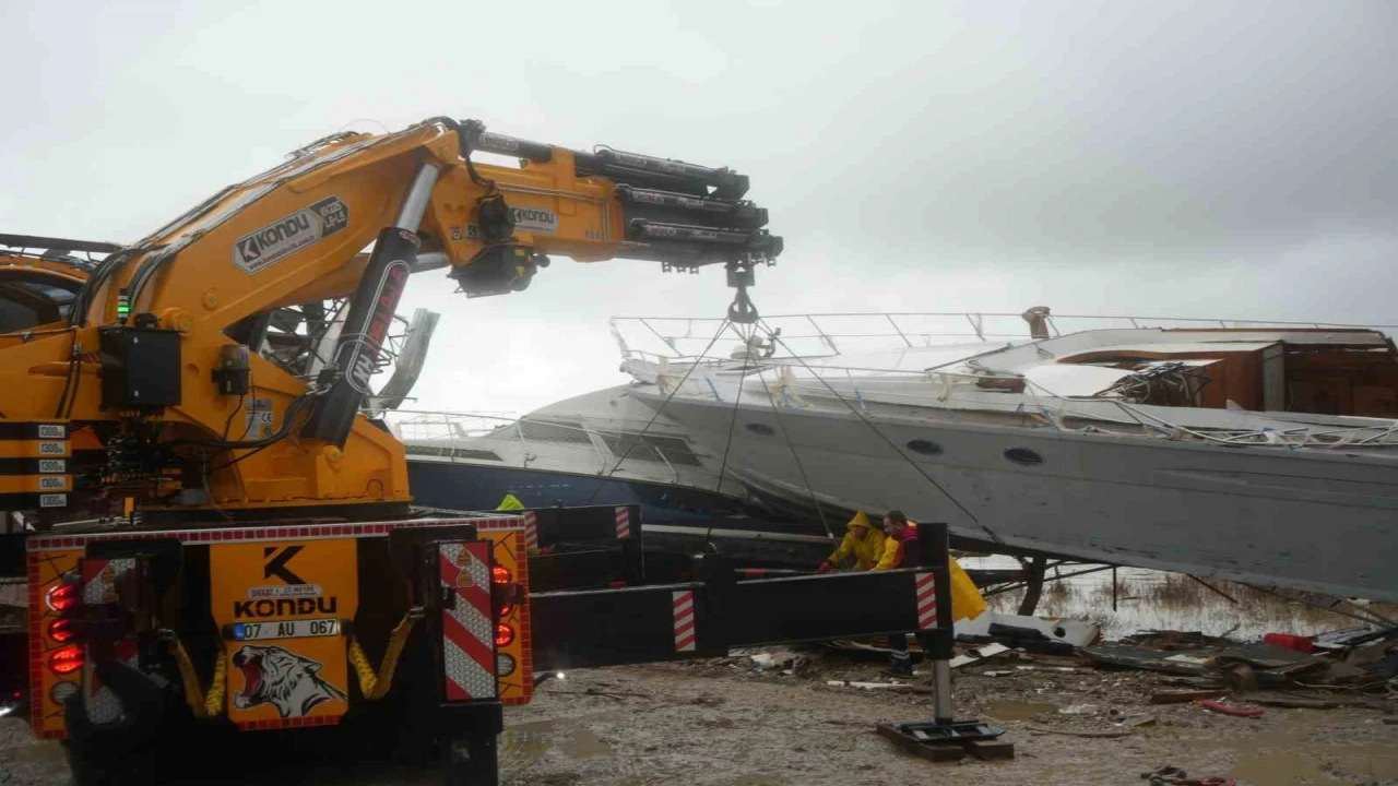 Felaketin ardından bugün alana vinç ve kepçe ekipleri sevk edildi. Aksu Belediyesi’nin düzenleme yaptığı alana, onarımı mümkün olan tekneler taşınmaya başlandı. Ekipler ve tekne sahipleri, uzun süre teknelerin römorklardan ayrılması için yoğun çaba gösterdi. Römorklardan ayrılan tekneler, vinç ve kepçe yardımıyla güvenli alana alınarak onarım sürecine hazırlandı.