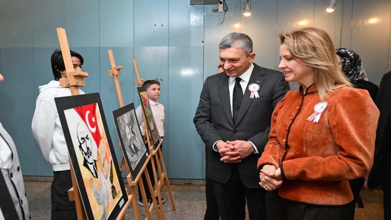 Programın sonunda Vali Hulusi Şahin, Atatürk Kültür Merkezi fuaye alanında Antalya Anadolu İmam Hatip Lisesi öğretmen ve öğrencileri tarafından hazırlanan resim ve el sanatları sergisini gezdi.